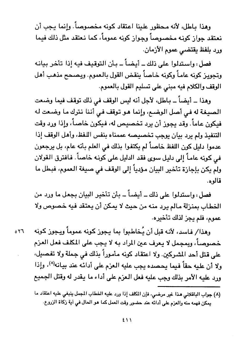 وهذا- أيضا-، لأجل أنه ليس الوقف في ذلك توقف فيما وضعت الصيغة له في أصل الوضع, وإنما هو توقف في أننا نترك ما وضعت له فيكون عاما. وقد يجوز أن يرد تخصيص له, فيكون خاصا, وإذا ورد وقت التنفيذ ولم يرد بيان يوجب تخصيصه عممناه بنفس اللفظ, وأهل الوقف إذا عدموا دليل كون اللفظ خاصا لم يكتفوا بذلك في العلم بأنه عام, بل يرجعون في كونه عاما إلى دليل سوى فقد الدليل على كونه خاصا. فافترق القولان ولم يكن بإجازة تأخير البيان مؤديا إلى الوقف في صيغة العموم، فبطل ما قالوه.