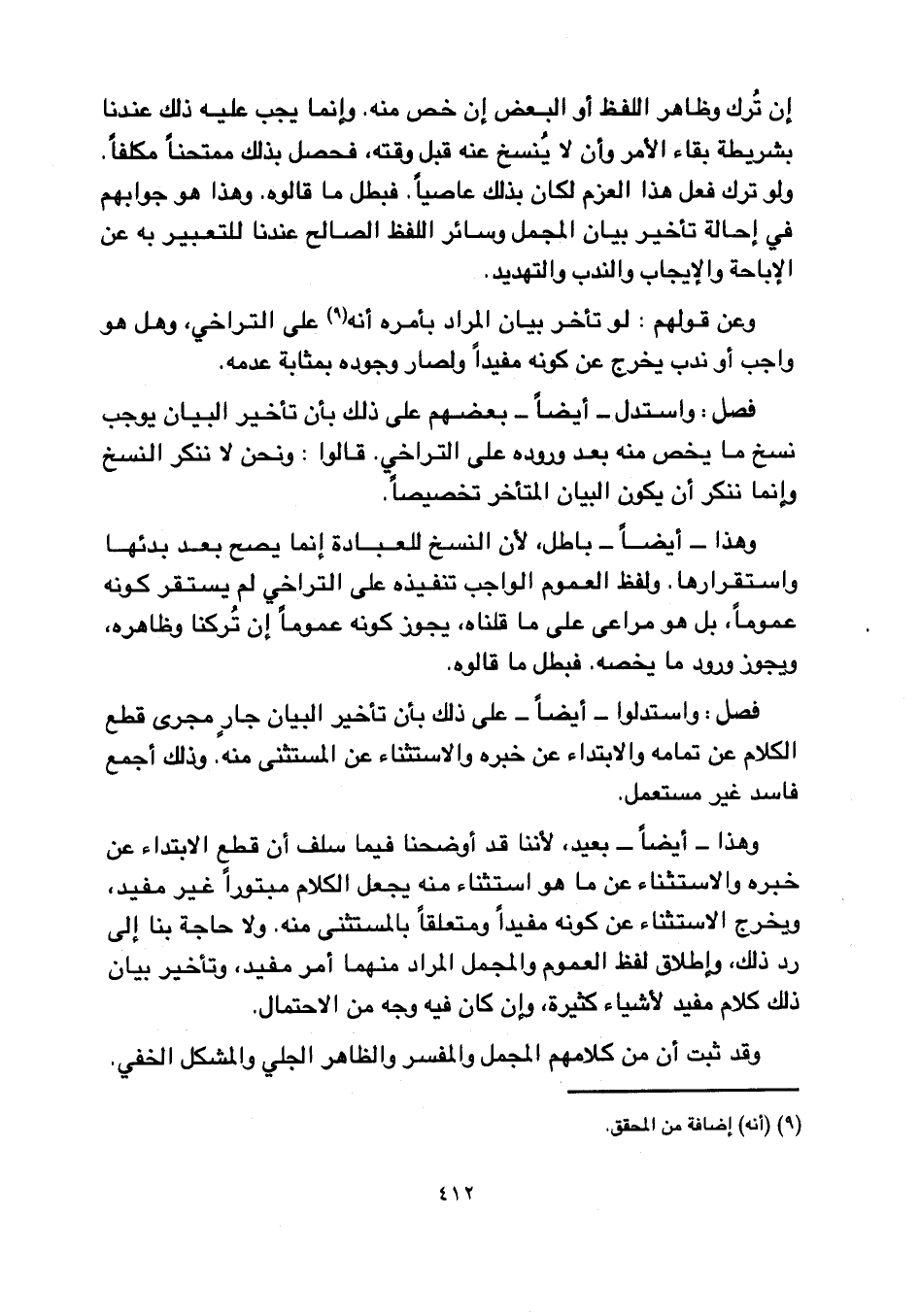 وهذا- أيضا- بعيد, لأننا قد أوضحنا فيما سلف أن قطع الابتداء عن خبره والاستثناء عن ما هو استثناء منه يجعل الكلام مبتورا غير مفيد, ويخرج الاستثناء عن كونه مفيدا ومتعلقا بالمستثنى منه. ولا حاجة بنا إلى رد ذلك. وإطلاق لفظ العموم والمجمل المراد منهما أمر مفيد, وتأخير بيان ذلك كلام مفيد لأشياء كثيرة, وإن كان فيه وجه من الاحتمال.