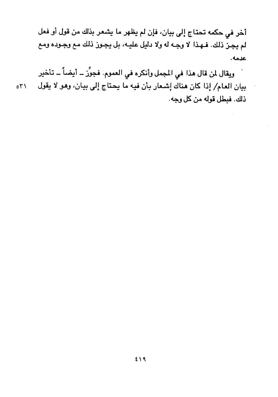 ويقال لمن قال هذا في المحمل وأمكره في العموم. فجوز- أيضا- تأخير بيان العام? إذا كان هناك إشعار بأن ما يحتاج إلى بيان, وهو لا يقول ذلك. فبطل قوله من كل وجه.
