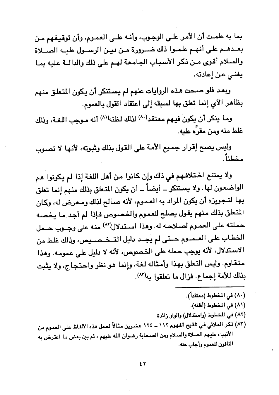 ولا يمتنع اختلافهم في ذلك وإن كانوا هن أهل اللغة إذا لم يكونوا هم الواضعون لها. ولا يستنكر- أيضا- أن يكون المتعلق بذلك منهم إنما تعلق بها لتجويزه أن يكون المراد به العموم، لأنه صالح لذلك ومعرض له، وكان المتعلق بذلك منهم يقول يصلح للعموم والخصوص فإذا لم أجد ما يخصه حملته على العموم لصلاحه له. وهذا استدلال منه على وجوب حمل الخطاب على العموم متى لم يجد دليل التخصيص، وذلك غلط من الاستدلال، لأنه يوجب حمله على الخصوص، لأنه لا دليل على عمومه، وهذا متقاوم. وليس التعلق بهذا وأمثاله لغة، وإنما هو نظر واحتجاج، ولا يثبت بذلك للأمة إجماع. فزال ما تعلقوا به.