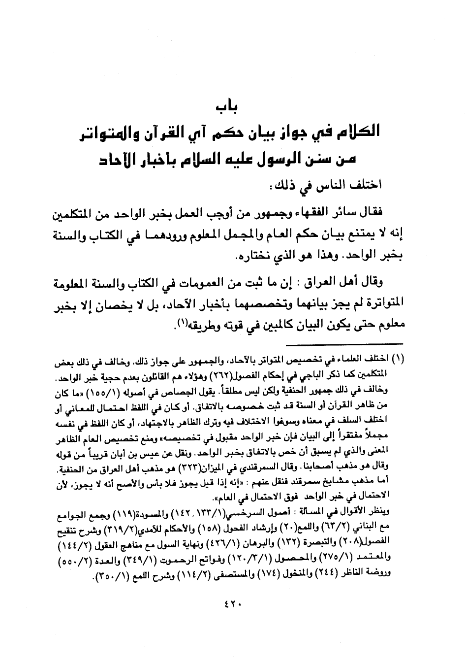 وقال أهل العراق: إن ما ثبت من العمومات في الكتاب والسنة المعلومة المتواترة لم يجز بيانهما وتخصصهما بأخبار الآحاد, بل لا يخصان إلا بخبر معلوم حتى يكون البيان كالمبين في قوته وطريقه