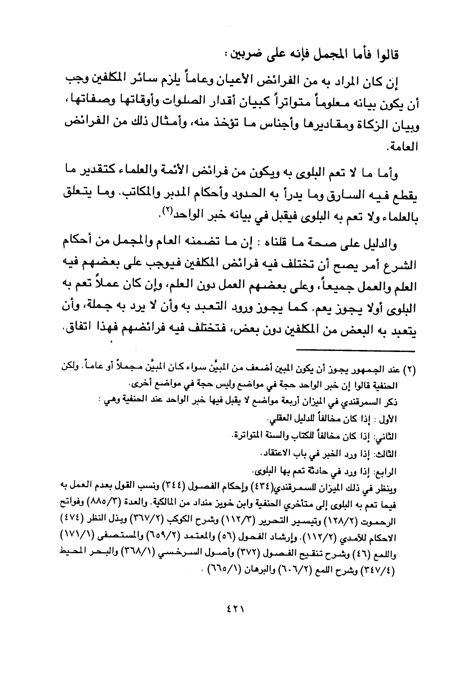 إن كان المراد به من الفرائض الأعيان وعاما يلزم سائر المكلفين وجب أن يكون بيانه معلوما متواترا كبيان أقدار الصوات وأوقاتها وصفاتها, وبيان الزكاة ومقاديرها وأجناس ما تؤخذ منه, وأمثال ذلك من الفرائض العامة.