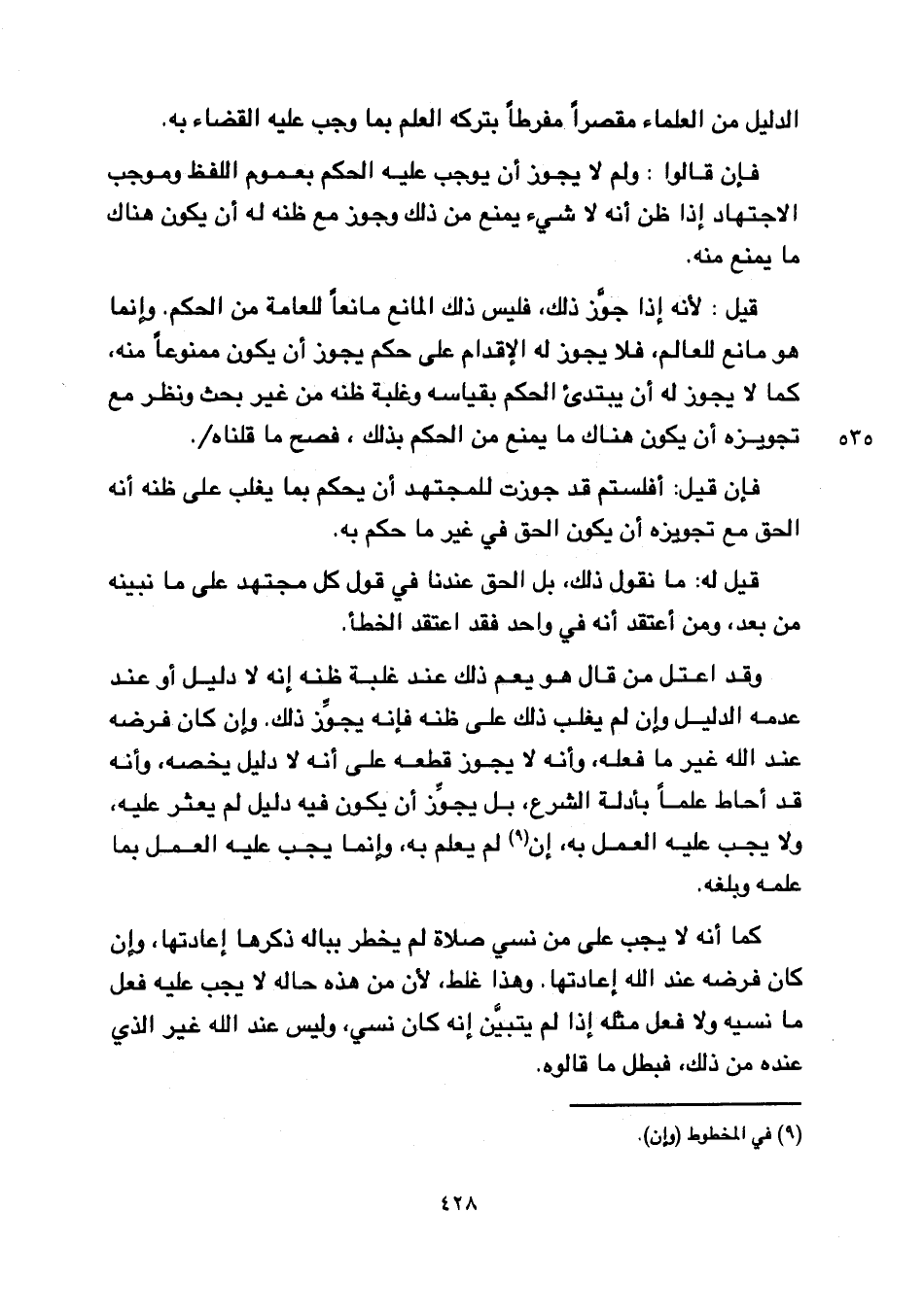 وقد اعتل من قال هو يعم ذلك عند غلبة ظنه إنه لا دليل أو عند عدمه الدليل وإن لم يغلب ذلك على ظنه فإنه يجوز ذلك. وإن كان فرضه عند الله غير ما فعله, وأنه لا يجوز قطعه على أنه لا دليل يخصه, وأنه قد أحاط علما بأدلة الشرع, بل يجوز أن يكون فيه دليل لم يعثر عليه, ولا يجب عليه العمل به, وإن لم يعلم به, وإنما يجب عليه العمل بما علمه وبلغه.