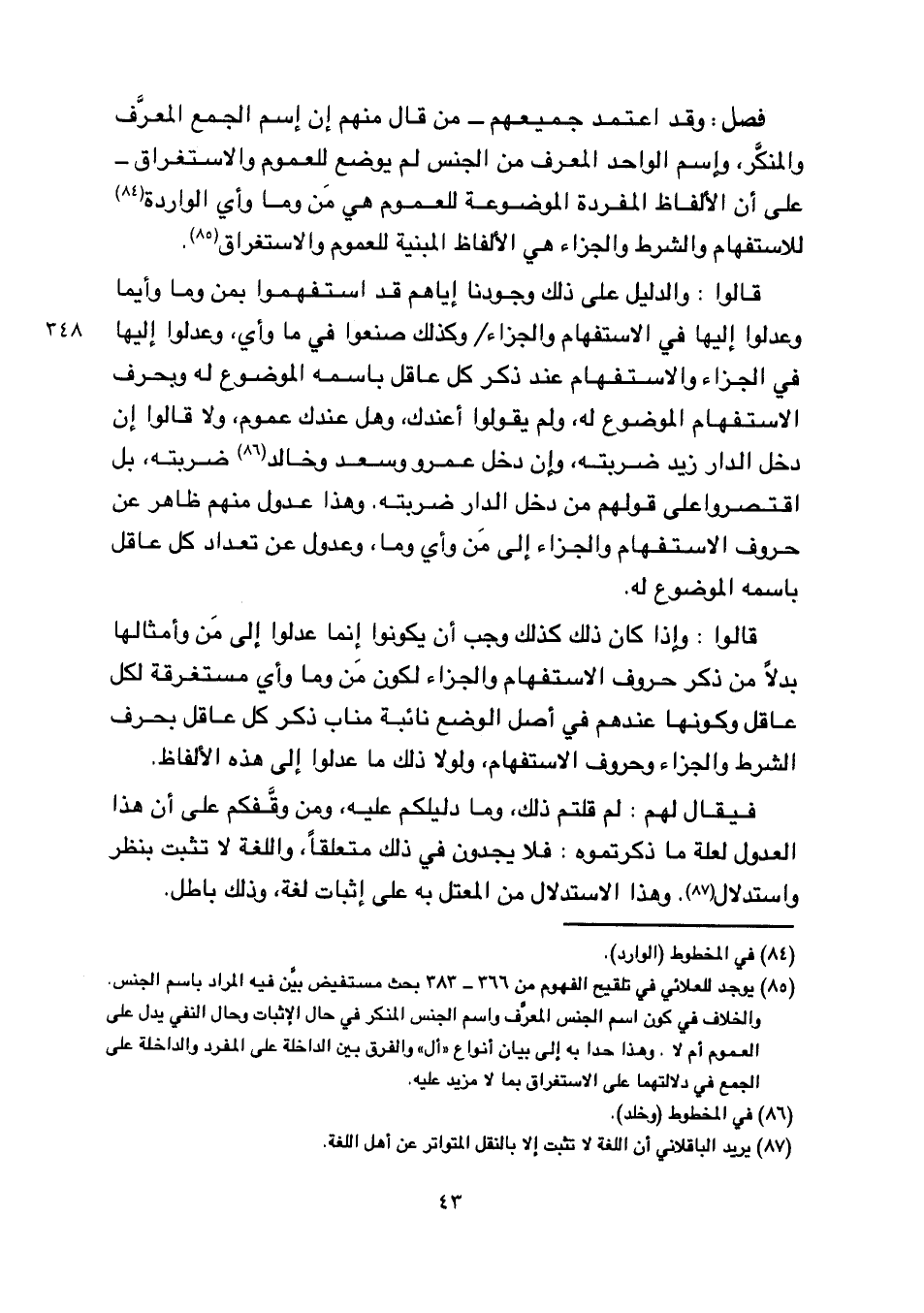 قالوا: والدليل على ذلك وجودنا إياهم قد استفهموا بمن وما وأيما وعدلوا إليها في الاستفهام والجزاء / وكذلك صنعوا في ما وأي، وعدلوا إليها في الجزاء والاستفهام عند ذكر كل عاقل باسمه الموضوع له وبحرف الاستفهام الموضوع له، ولم يقولوا أعندك، وهل عندك عموم، ولا قالوا إن دخل الدار زيد ضربته، وإن دخل عمرو وسعد وخالد ضربته، بل اقتصروا على قولهم من دخل الدار ضربته. وهذا عدول منهم ظاهر عن حروف الاستفهام والجزاء إلى من وأي وما، وعدول عن تعداد كل عاقل باسمه الموضوع له.
