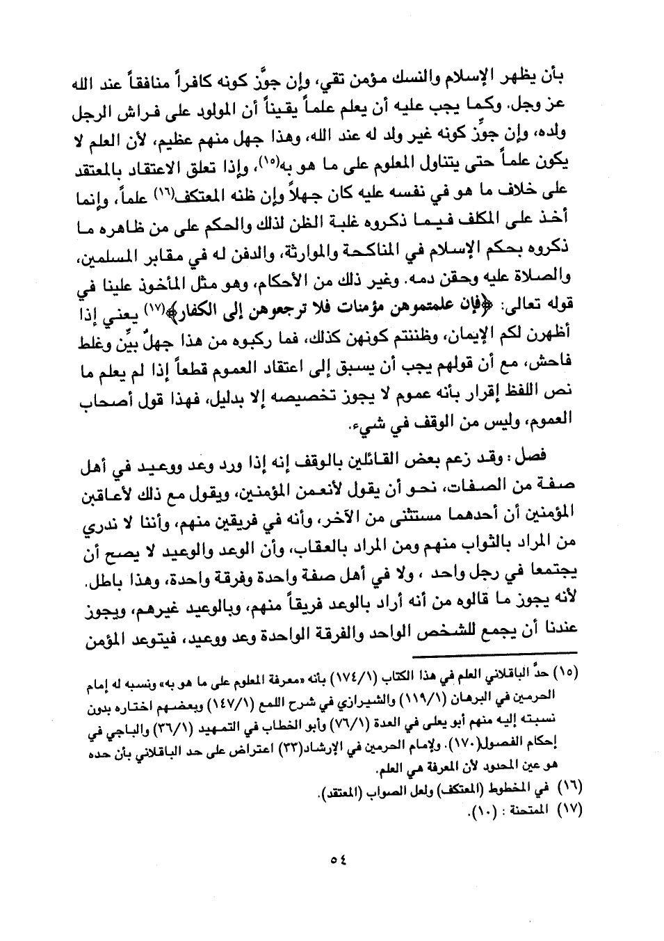 بأن يظهر الإسلام والنسل مؤمن تقي، وإن جوز كونه كافراً منافقاً عند الله عز وجل. وكما يجب عليه أن يعلم علماً يقيناً أن المولود على فراش الرجل ولده، وإن جوز كونه غير ولد له عند الله، وهذا جهل منهم عظيم، لأن العلم لا يكون علما حتى يتناول المعلوم على ما هو به، وإذا تعلق الاعتقاد بالمعتقد على خلاف ما هو في نفسه عليه كان جهلاً وإن ظنه المعتكف علماً، وإنما أخذ على المكلف فيما ذكروه غلبة الظن لذلك والحكم على من ظاهره ما ذكروه يحكم الإسلام في المناكحة والموارثة، والدفن له في مقابر المسلمين، والصلاة عليه وحقن دمه. وغير ذلك من الأحكام، وهو مثل المأخوذ علينا في قوله تعالى: {فَإنْ عَلِمْتُمُوهُنَّ مُؤْمِنَاتٍ فَلا تَرْجِعُوهُنَّ إلَى الكُفَّارِ} يعنى إذا أظهرن لكم الإيمان، وظننتم كونهن كذلك، فما ركبوه من هذا جهل بين وغلط فاحش، مع أن قولهم يجب أن يسبق إلى اعتقاد العموم قطعاً إذا لم يعلم ما نص اللفظ إقرار بأنه عموم لا يجوز تخصيصه إلا بدليل، فهذا قول أصحاب العموم، وليس من الوقف في شيء.