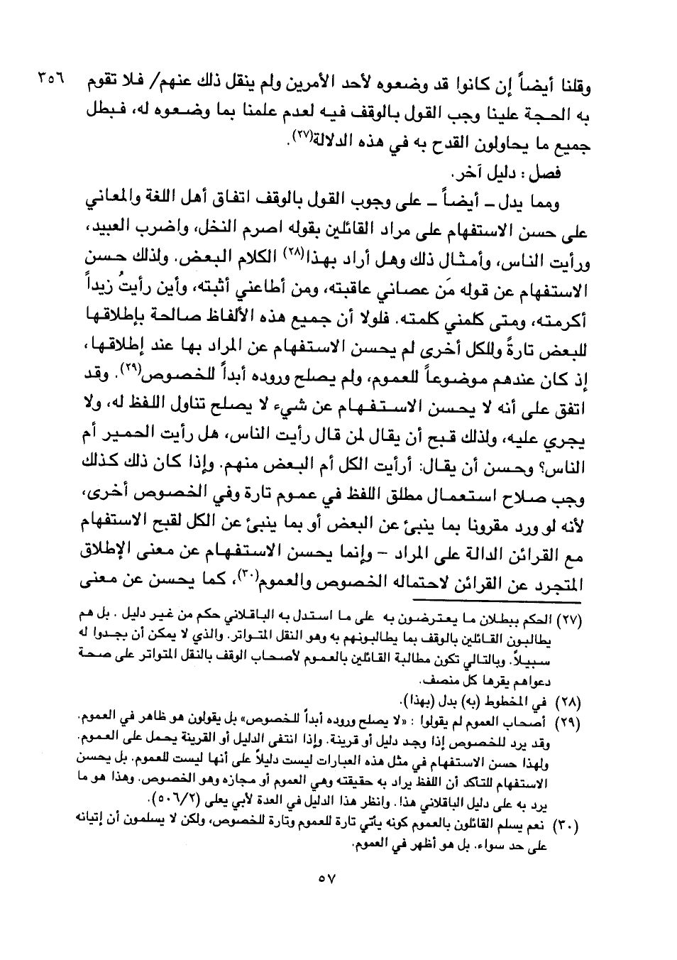 ومما يدل - أيضا - على وجوب القول بالوقف اتفاق أهل اللغة والمعاني على حسن الاستفهام على مراد القائلين بقوله اصرم النخل، واضرب العبيد، ورأيت الناس، وأمثال ذلك وهل أراد بهذا الكلام البعض. ولذلك حسن الاستفهام عن قوله من عصاني عاقبته، ومن أطاعني أثبته، وأين رأيت زيداً أكرمته، ومتى كلمني كلمته. فلولا أن جميع هذه الألفاظ صالحة بإطلاقها للبعض تارة وللكل أخرى لم يحسن الاستفهام عن المراد بها عند إطلاقها إذ كان عندهم موضوعاً للعموم، ولم يصلح وروده أبداً للخصوص، وقد اتفق على أنه لا يحسن الاستفهام عن شيء لا يصلح تناول اللفظ له، ولا يجري عليه، ولذلك قبح أن يقال لمن قال رأيت الناس، هل رأيت الحمير أم الناس؟ وحسن أن يقال: أرأيت الكل أم البعض منهم. وإذا كان ذلك كذلك وجب صلاح استعمال مطلق اللفظ في عموم تارة وفي الخصوص أخرى، لأنه لو ورد مقرونا بما ينبئ عن البعض أو بما ينبئ عن الكل لقبح الاستفهام مع القرائن الدالة على المراد - وإنما يحسن الاستفهام عن معنى الإطلاق المتجرد عن القرائن لاحتماله الخصوص والعموم، كما يحسن عن معنى