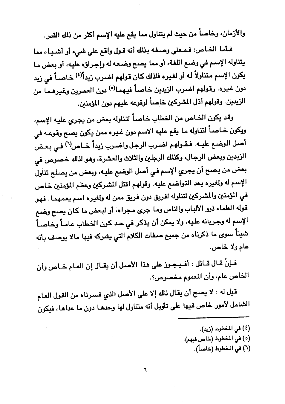 فأما الخاص: فمعنى وصفه بذلك أنه قول على شيء أو أشياء مما يتناوله الاسم في وضع اللغة, أو مما يصح وضعه له وإجراؤه عليه, أو بعض ما يكون الاسم متناولا له أو لغيره فلذلك كان قولهم اضرب زيدا خاضا في زيد دون غيره. قولهم اضرب الزيدين خاصا فيهما دون العمرين وغيرهما من الزيدين. وقولهم أذل المشركين خاصا لوقوعه عليهم دون المؤمنين.