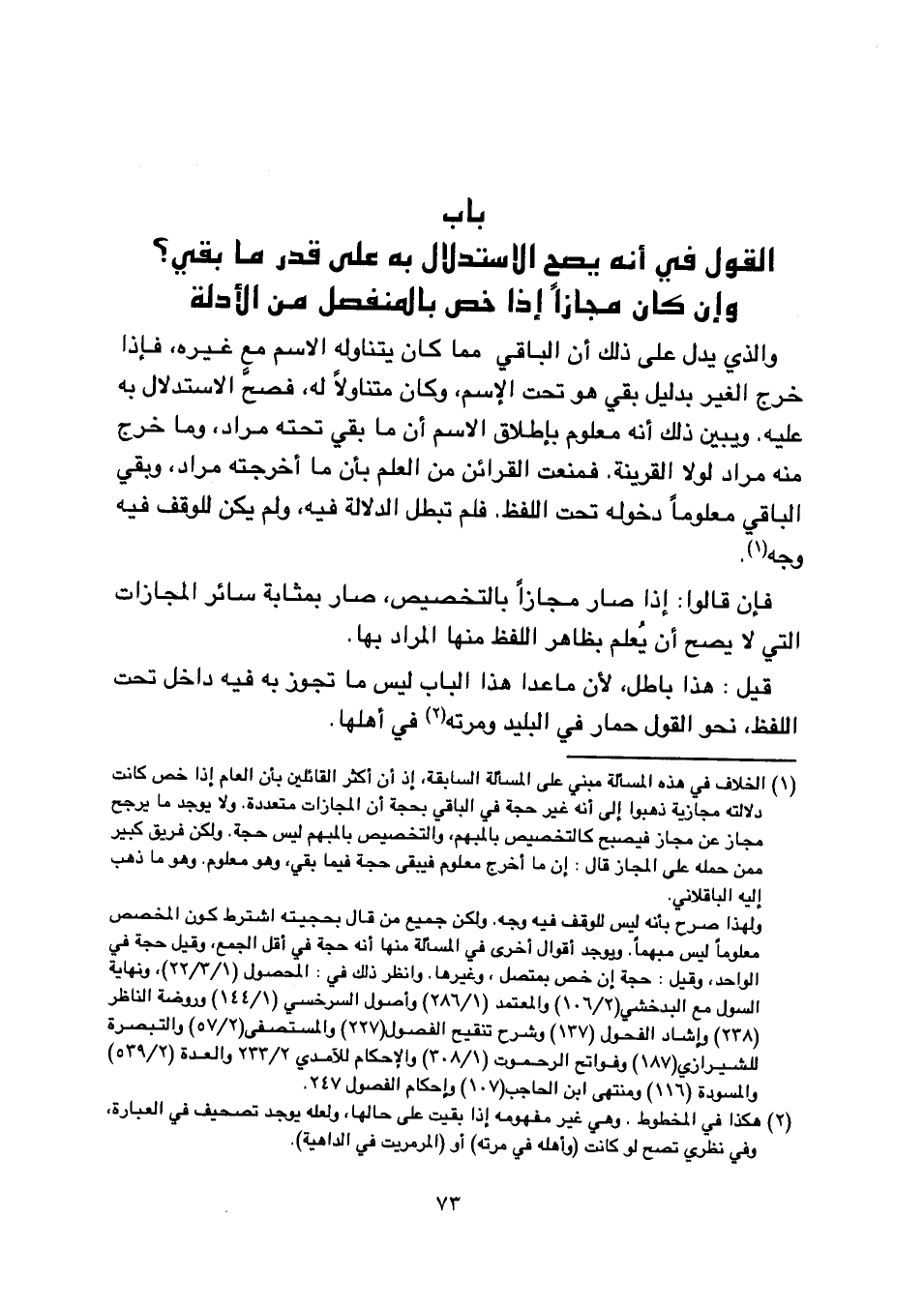 والذي يدل على ذلك أن الباقي مما كان يتناوله الاسم مع غيره, فإذا خرج الغير بدليل بقي هو تحت الاسم, وكان متناولاً له, فصح الاستدلال به عليه, ويبين ذلك أنه معلوم بإطلاق الاسم أن ما بقي تحته مراد, وما خرج منه مراد لولا القرينة. فمنعت القرائن من العلم بأن ما أخرجته مراد, وبقي الباقي معلومًا دخوله تحت اللفظ. فلم تبطل الدلالة فيه, ولم يكن للوقف فيه وجه.