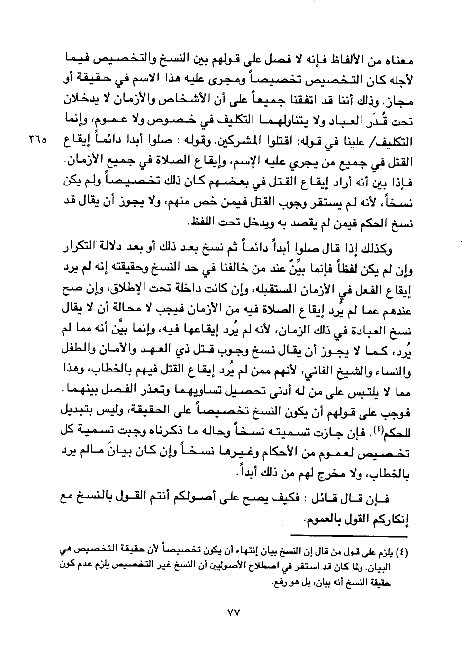 وكذلك إذا قال صلوا أبدًا دائمًا ثم نسخ بعد ذلك أو بعد دلالة التكرار وإن لم يكن لفظًا فإنما بين عند من خالفنا في حد النسخ وحقيقته إنه لم يرد إيقاع في الأزمان المستقبله, وإن كانت داخلة تحت الإطلاق, وإن صح عندهم عما لم يرد إيقاع الصلاة فيه من الأزمان فيجب لا محالة أن لا يقال نسخ العبادة في ذلك الزمان, لأنه لم يرد إيقاعها فيه, وإنما بين أنه مما لم يرد, كما لا يجوز أن يقال نسخ وجوب قتل ذي العهد والأمان والطفل والنساء والشيخ الفاني, لأنهم ممن لم يرد إيقاع القتل فيهم بالخطاب, وهذا مما لا يلتبس على من له أدنى تحصيل تساويهما وتعذر الفصل بينهما. فوجب على قولهم أن يكون النسخ تخصيصًا على الحقيقة, وليس بتبديل للحكم. فإن جازت تسميته نسخًا وحاله ما ذكرناه وجبت تسمية كل تخصيص لعموم من الأحكام وغيرها نسخًا وإن كان بيان ما لم يرد بالخطاب, ولا مخرج لهم من ذلك أبدًا.