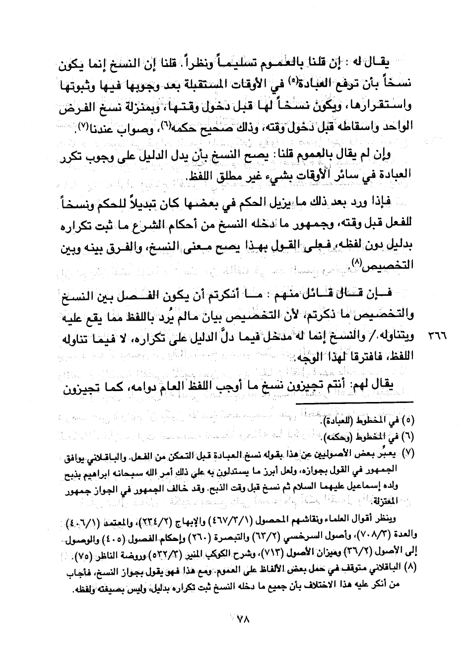 فإذا ورد بعد ذلك ما يزيل الحكم في بعضها كان تبديلاً للحكم ونسخًا للفعل قبل وقته, وجمهور ما دخله النسخ من أحكام الشرع ما ثبت تكراره بدليل دون لفظه, فعلى القول بهذا يصح معنى النسخ, والفرق بينه وبين التخصيص.