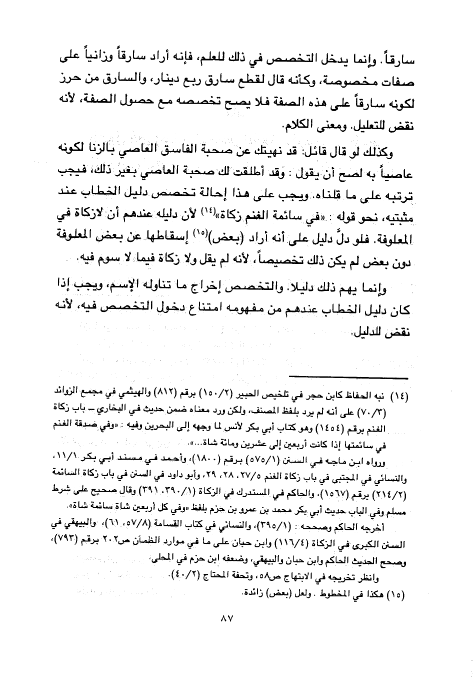 وكذلك لو قال قائل: فد نهيتك عن صحبة الفاسق العاصي بالزنا لكونه عاصيًا له لصح أن يقول: وقد أطلقت لك صحبة العاصي بغير ذلك, فيجب ترتبه على ما قلناه. ويجب على هذه إحالة تخصص دليل الخطاب عند مثبتيه, نحو قوله: "في سائمة الغنم زكاة" لأن دليله عندهم أن لا زكاة في المعلوفة. فلو دل دليل على أنه أراد (بعض) إسقاطها عن بعض المعلوفة دون بعض لم يكن ذلك تخصيصًا, لأنه لم يقل ولا زكاة فيما لا سوم فيه.