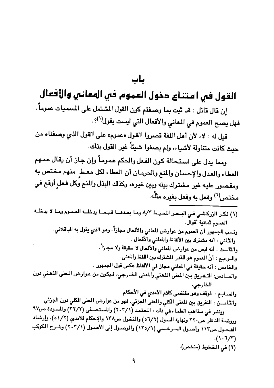 إن قال قائل: قد ثبت بما وصفتم كون القول المشتمل على المسميات عموما فهل يصح العموم في المعاني والأفعال التي ليست بقول؟.