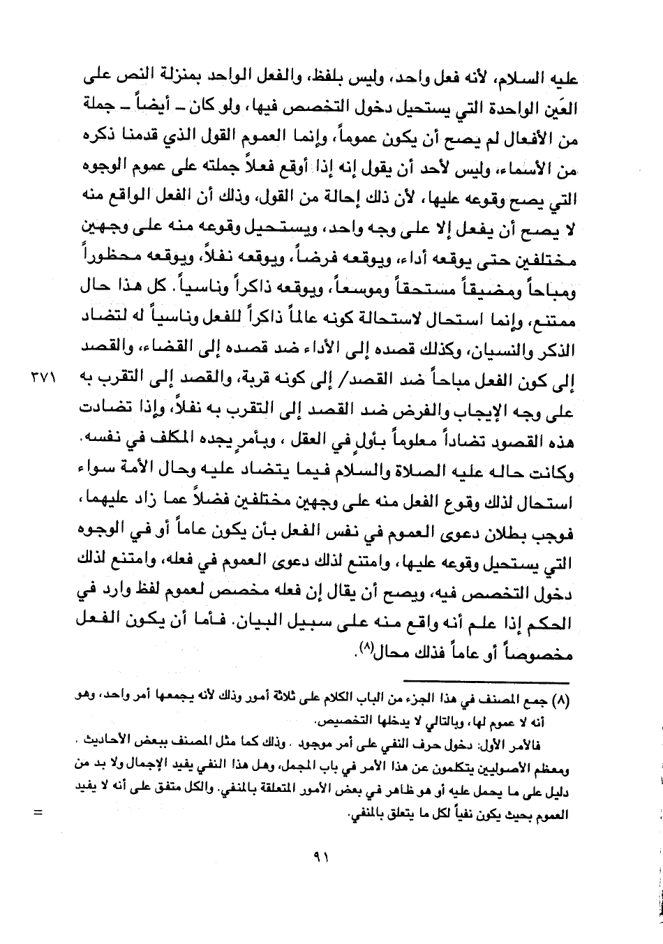 عليه السلام, لأنه فعل واحد, وليس بلفظ, والفعل الواحد بمنزلة النص على العين الواحدة التي يستحيل دخول التخصص فيها, ولو كان- أيضًا- جملة من الأفعال لم يصح أن يكون عمومًا, وإنما العموم القول الذي قدمنا ذكره من الأسماء, وليس لأحد أن يقول إنه إذا أوقع فعلاً جملته على عموم الوجوه التي يصح وقوعه عليها, لأن ذلك إحالة من القول, وذلك أن الفعل الواقع منه لا يصح أن يفعل إلا على وجه واحد, ويستحيل وقوعه منه على وجهين مختلفين حتى يوقعه أداء, ويوقعه فرضًا, ويوقعه نفلاً, ويوقعه محظورًا ومباحًا ومضيقًا مستحقًا وموسعًا, ويوقعه ذاكرًا وناسيًا. كل هذا الحال ممتنع, وإنما استحال لاستحالة كونه عالمًا ذاكرًا للفعل وناسيًا له لتضاد الذكر والنسيان, وكذلك قصده إلى الأداء ضد قصده إلى القضاء, والقصد إلى كون الفعل مباحًا ضد القصد/ إلى كونه قربة, والقصد إلى التقرب به على وجه الإيجاب والفرض ضد القصد إلى التقرب به نفلاً, وإذا تضادت هذه القصود تضادًا معلومًا بأول في العقل, وبأمر يجده المكلف في نفسه. وكانت حاله عليه الصلاة والسلام فيما يتضاد عليه وحال الأمة سواء استحال ذلك وقوع الفعل منه على وجهين مختلفين فضلاً عما زاد عليهما, فوجب بطلان دعوى العموم في نفس الفعل بان يكون عامًا أو في الوجوه التي يستحيل وقوعه عليها, وامتنع لذلك دعوى العموم في فعله, وامتنع لذلك دخول التخصص فيه, ويصح أن يقال إن فعله مخصص لعموم لفظ وارد في دخول التخصص فيه, ويصح أن يقال إن فعله مخصص لعموم لفظ وارد في الحكم إذا علم أنه واقع منه على سبيل البيان. فأما أن يكون الفعل مخصوصًا أو عامًا فذلك محال.