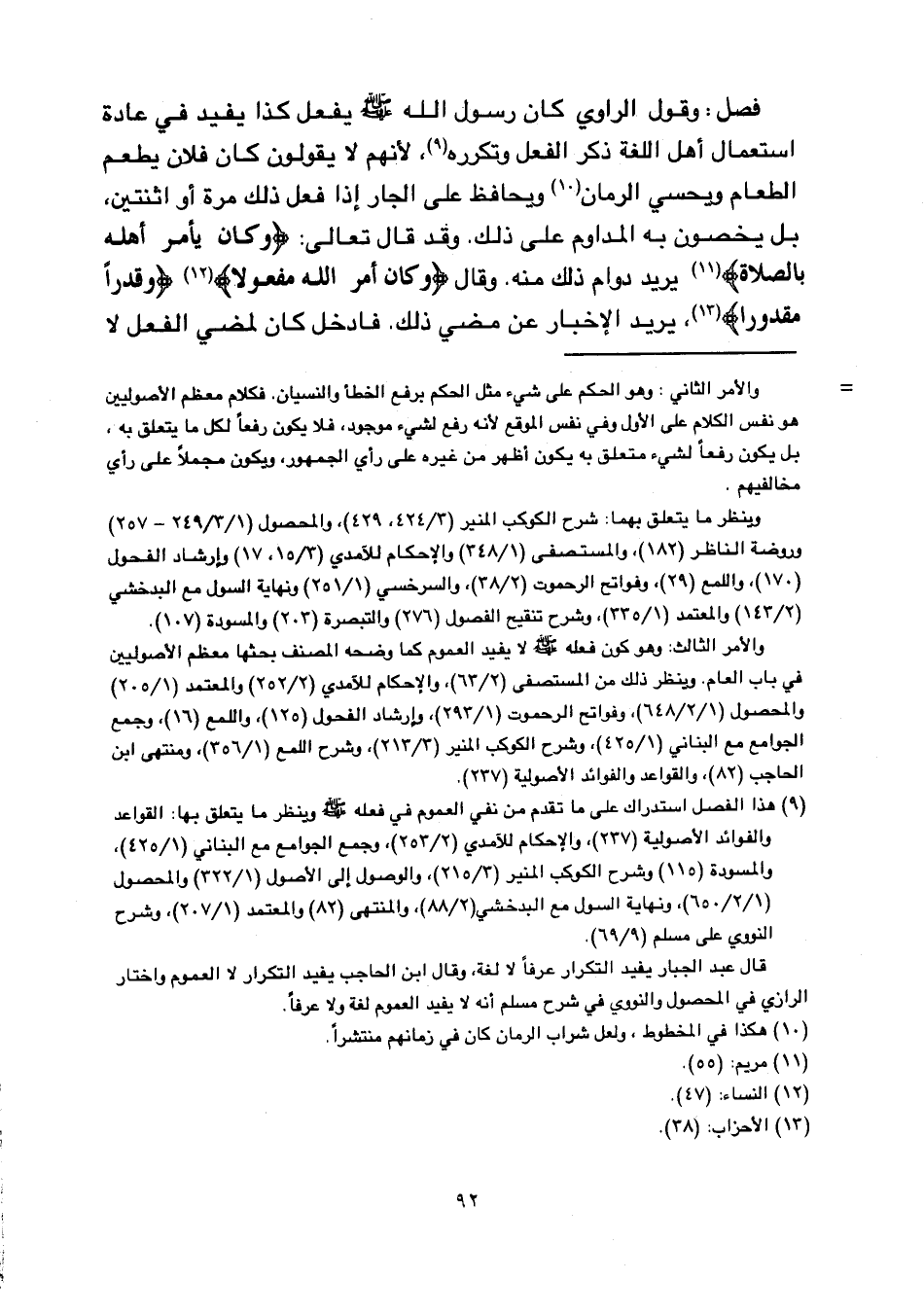 فصل: وقول الراوي كان رسول الله صلى الله عليه وسلم يفعل كذا يفيد في عادة استعمال أهل اللغة ذكر الفعل وتكرره, لأنهم لا يقولون كان فلان يطعم الطعام ويحسي الرمان ويحافظ على الجار إذا فعل ذلك مرة أو اثنتين, بل يخصون به المداوم على ذلك. وقد قال تعالى: {وكَانَ يَامُرُ أَهْلَهُ بِالصَّلاةِ} يريد دوام ذلك منه. وقال {وكَانَ أَمْرُ اللَّهِ مَفْعُولاً} {قَدَرًا مَّقْدُورًا} , يريد الإخبار عن مضي ذلك. فادخل كان لمضي الفعل لا