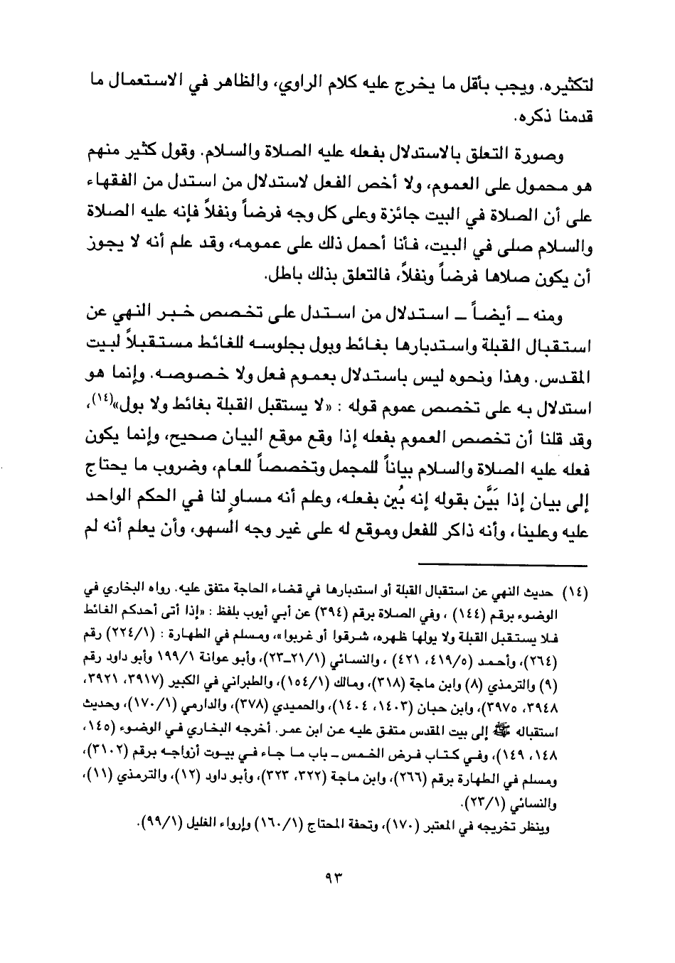 ومنه- أيضًا- استدلال من استدل على تخصص خبر النهي عن استقبال القبلة واستدبارها بغائط وبول بجلوسه للغائط مستقبلاً لبيت المقدس. وهذا ونحوه ليس باستدلال بعموم فعل ولا خصوصه. وإنما هو استدلال به على تخصص عموم قوله: "لا يستقبل القبلة بغائط ولا بول", وقد قلنا أن تخصص العموم بفعله إذا وقع موقع البيان صحيح, وإنما يكون فعله عليه الصلاة والسلام بيانًا للمجمل وتخصصًا للعام, وضروب ما يحتاج إلى بيان إذا بين بقوله إنه بين بفعله, وعلم أنه مساو لنا في الحكم الواحد عليه وعلينا, وأنه ذاكر للفعل وموقع له على غير وجه السهو, وأن يعلم أنه لم