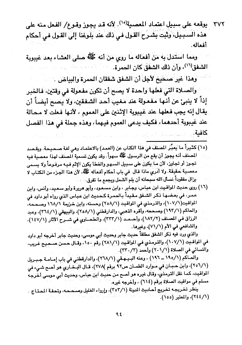 والصلاة التي فعلها واحدة لا يصح أن تكون مفعولة في وقتين, فالخبر إذًا لا ينبئ عن أنها مفعولة عند مغيب أحد الشفقين, ولا يصح أيضًا أن يقال إنه يجب فعلها عند غيبوبة الاثنين على العموم, لأنها فعلت لا محالة عند غيبوبة أحدهما, فكيف يدعي العموم فيها, وهذه جملة في هذا الفصل كافية.