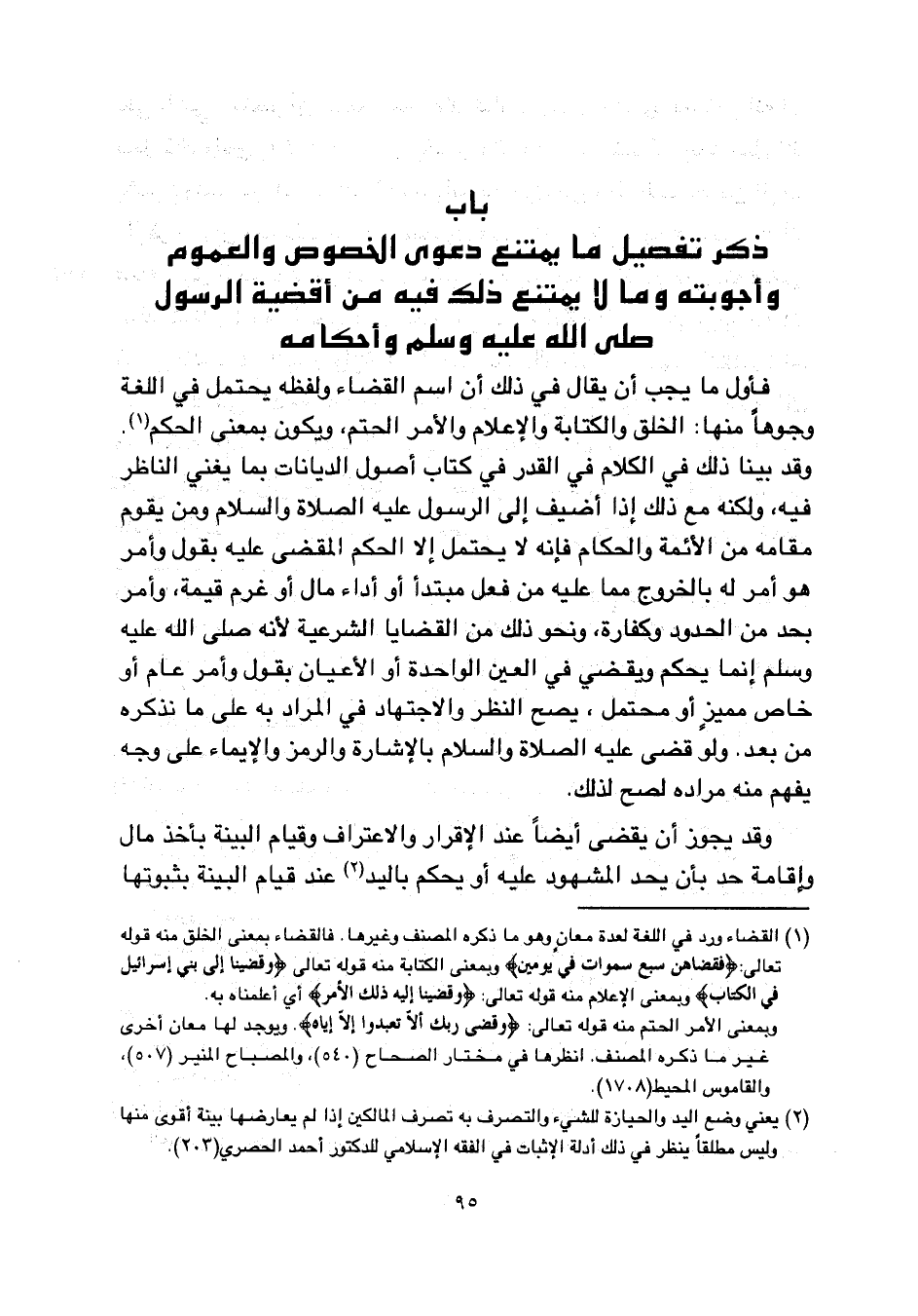 فأول ما يجب أن يقال في ذلك أن لسم القضاء ولفظه يحتمل في اللغة وجوهًا منها: الخلق والكتابة والإعلام والأمر الحتم, ويكون بمعنى الحكم. وقد بينا ذلك في الكلام في القدر في كتاب أصول الديانات بما يغني الناظر فيه, ولكنه مع ذلك إذا أضيف إلى الرسول عليه الصلاة والسلام ومن يقوم مقامه من الأئمة والحكام فإنه لا يحتمل إلا الحكم المقضي عليه بقول وأمر هو أمر له بالخروج مما عليه من فعل مبتدأ أو أداء مال أو غرم قيمة, وأمر بحد من الحدود وكفارة, ونحو ذلك من القضايا الشرعية لأنه صلى الله عليه وسلم إنما يحكم ويقضي في العين الواحدة أو الأعيان بقول وأمر عام أو خاص مميز أو محتمل, يصح النظر والاجتهاد في المراد به على ما نذكره من بعد. ولو قضى عليه الصلاة والسلام بالإشارة والرمز والإيماء على وجه يفهم منه مراده لصح لذلك.
