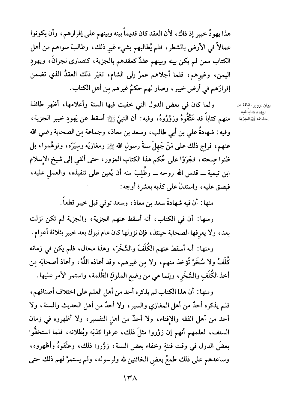 وَلَمَّا كَانَ فِي بَعْضِ الدُّوَلِ الَّتِي خَفِيَتْ فِيهَا السُّنَّةُ وَأَعْلَامُهَا، أَظْهَرَ طَائِفَةٌ مِنْهُمْ كِتَابًا قَدْ عَتَّقُوهُ وَزَوَّرُوهُ، وَفِيهِ أَنَّ النَّبِيَّ صَلَّى اللَّهُ عَلَيْهِ وَسَلَّمَ أَسْقَطَ عَنْ يَهُودِ خَيْبَرَ الْجِزْيَةَ، وَفِيهِ شَهَادَةُ عَلِيِّ بْنِ أَبِي طَالِبٍ، وَسَعْدِ بْنِ مُعَاذٍ، وَجَمَاعَةٍ مِنَ الصَّحَابَةِ رَضِيَ اللَّهُ عَنْهُمْ، فَرَاجَ ذَلِكَ عَلَى مَنْ جَهِلَ سُنَّةَ رَسُولِ اللَّهِ صَلَّى اللَّهُ عَلَيْهِ وَسَلَّمَ وَمَغَازِيَهُ وَسِيَرَهُ، وَتَوَهَّمُوا، بَلْ ظَنُّوا صِحَّتَهُ، فَجَرَوْا عَلَى حُكْمِ هَذَا الْكِتَابِ الْمُزَوَّرِ حَتَّى أُلْقِيَ إِلَى شَيْخِ الْإِسْلَامِ ابن تيمية - قَدَّسَ اللَّهُ رُوحَهُ - وَطُلِبَ مِنْهُ أَنْ يُعِينَ عَلَى تَنْفِيذِهِ، وَالْعَمَلِ عَلَيْهِ، فَبَصَقَ عَلَيْهِ، وَاسْتَدَلَّ عَلَى كَذِبِهِ بِعَشَرَةِ أَوْجُهٍ:
