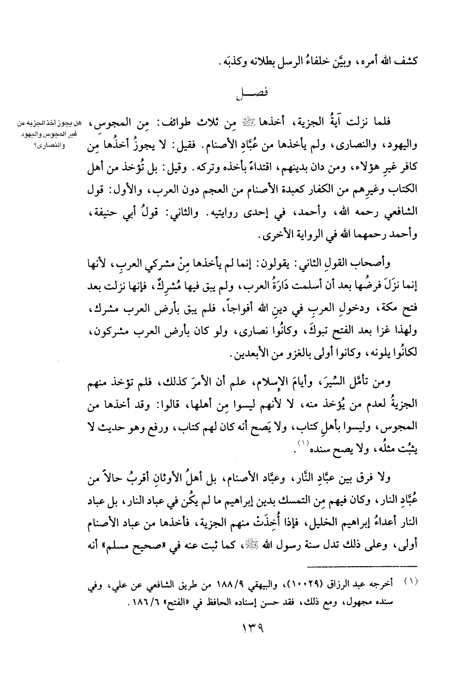 وَمَنْ تَأَمَّلَ السِّيَرَ، وَأَيَّامَ الْإِسْلَامِ، عَلِمَ أَنَّ الْأَمْرَ كَذَلِكَ، فَلَمْ تُؤْخَذْ مِنْهُمُ الْجِزْيَةُ لِعَدَمِ مَنْ يُؤْخَذُ مِنْهُ، لَا لِأَنَّهُمْ لَيْسُوا مِنْ أَهْلِهَا، قَالُوا: وَقَدْ أَخَذَهَا مِنَ الْمَجُوسِ، وَلَيْسُوا بِأَهْلِ كِتَابٍ وَلَا يَصِحُّ أَنَّهُ (كَانَ لَهُمْ كِتَابٌ وَرُفِعَ) وَهُوَ حَدِيثٌ لَا يَثْبُتُ مِثْلُهُ، وَلَا يَصِحُّ سَنَدُهُ.