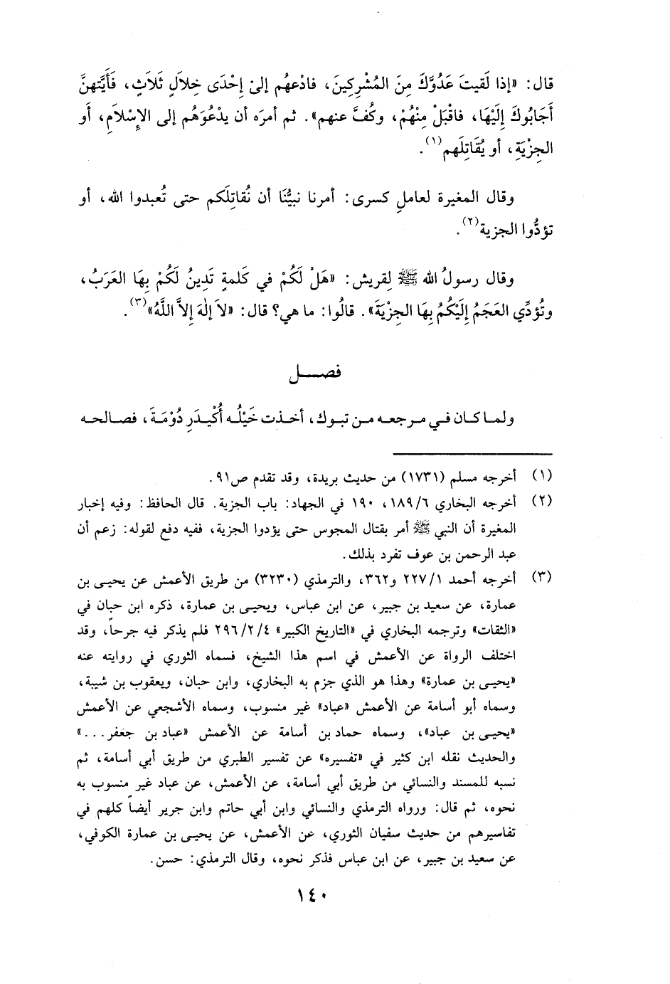 وَقَالَ المغيرة لِعَامِلِ كِسْرَى: ( «أَمَرَنَا نَبِيُّنَا أَنْ نُقَاتِلَكُمْ حَتَّى تَعْبُدُوا اللَّهَ، أَوْ تُؤَدُّوا الْجِزْيَةَ» ) .
