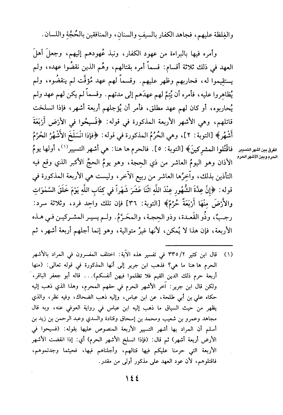 وَأَمَرَهُ فِيهَا بِالْبَرَاءَةِ مِنْ عُهُودِ الْكُفَّارِ، وَنَبْذِ عُهُودِهِمْ إِلَيْهِمْ، وَجَعَلَ أَهْلَ الْعَهْدِ فِي ذَلِكَ ثَلَاثَةَ أَقْسَامٍ: قِسْمًا أَمَرَهُ بِقِتَالِهِمْ، وَهُمُ الَّذِينَ نَقَضُوا عَهْدَهُ وَلَمْ يَسْتَقِيمُوا لَهُ، فَحَارَبَهُمْ وَظَهَرَ عَلَيْهِمْ. وَقِسْمًا لَهُمْ عَهْدٌ مُؤَقَّتٌ لَمْ يَنْقُضُوهُ وَلَمْ يُظَاهِرُوا عَلَيْهِ، فَأَمَرَهُ أَنْ يُتِمَّ لَهُمْ عَهْدَهُمْ إِلَى مُدَّتِهِمْ. وَقِسْمًا لَمْ يَكُنْ لَهُمْ عَهْدٌ وَلَمْ يُحَارِبُوهُ، أَوْ كَانَ لَهُمْ عَهْدٌ مُطْلَقٌ، فَأُمِرَ أَنْ يُؤَجِّلَهُمْ أَرْبَعَةَ أَشْهُرٍ، فَإِذَا انْسَلَخَتْ قَاتَلَهُمْ وَهِيَ الْأَشْهُرُ الْأَرْبَعَةُ الْمَذْكُورَةُ فِي قَوْلِهِ: {فَسِيحُوا فِي الْأَرْضِ أَرْبَعَةَ أَشْهُرٍ} [التوبة: 2] [التَّوْبَةِ: 2] وَهِيَ الْحُرُمُ الْمَذْكُورَةُ فِي قَوْلِهِ: {فَإِذَا انْسَلَخَ الْأَشْهُرُ الْحُرُمُ فَاقْتُلُوا الْمُشْرِكِينَ} [التوبة: 5] [التَّوْبَةِ: 5] فَالْحُرُمُ هَاهُنَا: هِيَ أَشْهُرُ التَّسْيِيرِ، أَوَّلُهَا يَوْمُ الْأَذَانِ، وَهُوَ الْيَوْمُ الْعَاشِرُ مِنْ ذِي الْحِجَّةِ، وَهُوَ يَوْمُ الْحَجِّ الْأَكْبَرِ الَّذِي وَقَعَ فِيهِ التَّأْذِينُ بِذَلِكَ، وَآخِرُهَا الْعَاشِرُ مِنْ رَبِيعٍ الْآخِرِ، وَلَيْسَتْ هِيَ الْأَرْبَعَةَ الْمَذْكُورَةَ فِي قَوْلِهِ: {إِنَّ عِدَّةَ الشُّهُورِ عِنْدَ اللَّهِ اثْنَا عَشَرَ شَهْرًا فِي كِتَابِ اللَّهِ يَوْمَ خَلَقَ السَّمَاوَاتِ وَالْأَرْضَ مِنْهَا أَرْبَعَةٌ حُرُمٌ} [التوبة: 36] [التَّوْبَةِ: 36] فَإِنَّ تِلْكَ وَاحِدٌ فَرْدٌ، وَثَلَاثَةٌ سَرْدٌ: رَجَبٌ، وَذُو الْقَعْدَةِ، وَذُو الْحِجَّةِ، وَالْمُحَرَّمُ. وَلَمْ يُسَيِّرِ الْمُشْرِكِينَ فِي هَذِهِ الْأَرْبَعَةِ، فَإِنَّ هَذَا لَا يُمْكِنُ لِأَنَّهَا غَيْرُ مُتَوَالِيَةٍ، وَهُوَ إِنَّمَا أَجَّلَهُمْ أَرْبَعَةَ أَشْهُرٍ ثُمَّ