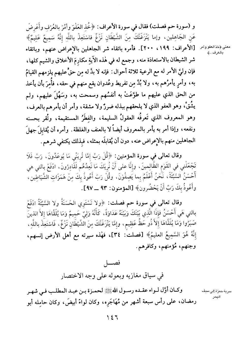وَ (سُورَةِ حم فُصِّلَتْ) فَقَالَ فِي سُورَةِ الْأَعْرَافِ {خُذِ الْعَفْوَ وَأْمُرْ بِالْعُرْفِ وَأَعْرِضْ عَنِ الْجَاهِلِينَ - وَإِمَّا يَنْزَغَنَّكَ مِنَ الشَّيْطَانِ نَزْغٌ فَاسْتَعِذْ بِاللَّهِ إِنَّهُ سَمِيعٌ عَلِيمٌ} [الأعراف: 199 - 200] [الْأَعْرَافِ: 199 - 200] فَأَمَرَهُ بِاتِّقَاءِ شَرِّ الْجَاهِلِينَ بِالْإِعْرَاضِ عَنْهُمْ، وَبِاتِّقَاءِ شَرِّ الشَّيْطَانِ بِالِاسْتِعَاذَةِ مِنْهُ، وَجَمَعَ لَهُ فِي هَذِهِ الْآيَةِ مَكَارِمَ الْأَخْلَاقِ وَالشِّيَمَ كُلَّهَا، فَإِنَّ وَلِيَّ الْأَمْرِ لَهُ مَعَ الرَّعِيَّةِ ثَلَاثَةُ أَحْوَالٍ: فَإِنَّهُ لَا بُدَّ لَهُ مِنْ حَقٍّ عَلَيْهِمْ يَلْزَمُهُمُ الْقِيَامُ بِهِ، وَأَمْرٍ يَأْمُرُهُمْ بِهِ، وَلَا بُدَّ مِنْ تَفْرِيطٍ وَعُدْوَانٍ يَقَعُ مِنْهُمْ فِي حَقِّهِ، فَأُمِرَ بِأَنْ يَأْخُذَ مِنَ الْحَقِّ الَّذِي عَلَيْهِمْ مَا طَوَّعَتْ بِهِ أَنْفُسُهُمْ، وَسَمَحَتْ بِهِ، وَسَهُلَ عَلَيْهِمْ، وَلَمْ يَشُقَّ، وَهُوَ الْعَفْوُ الَّذِي لَا يَلْحَقُهُمْ بِبَذْلِهِ ضَرَرٌ وَلَا مَشَقَّةٌ، وَأُمِرَ أَنْ يَأْمُرَهُمْ بِالْعُرْفِ، وَهُوَ الْمَعْرُوفُ الَّذِي تَعْرِفُهُ الْعُقُولُ السَّلِيمَةُ، وَالْفِطَرُ الْمُسْتَقِيمَةُ، وَتُقِرُّ بِحُسْنِهِ وَنَفْعِهِ، وَإِذَا أَمَرَ بِهِ يَأْمُرُ بِالْمَعْرُوفِ أَيْضًا لَا بِالْعُنْفِ وَالْغِلْظَةِ. وَأَمَرَهُ أَنْ يُقَابِلَ جَهْلَ الْجَاهِلِينَ مِنْهُمْ بِالْإِعْرَاضِ عَنْهُ دُونَ أَنْ يُقَابِلَهُ بِمِثْلِهِ، فَبِذَلِكَ يَكْتَفِي شَرَّهُمْ.