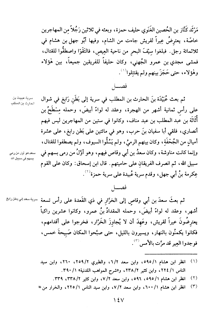 ثُمَّ بَعَثَ عُبَيْدَةَ بْنَ الْحَارِثِ بْنِ الْمُطَّلِبِ فِي سَرِيَّةٍ إِلَى بَطْنِ رَابِغٍ فِي شَوَّالٍ عَلَى رَأْسِ ثَمَانِيَةِ أَشْهُرٍ مِنَ الْهِجْرَةِ، وَعَقَدَ لَهُ لِوَاءً أَبْيَضَ، وَحَمَلَهُ مسطح بن أثاثة بن عبد المطلب بن عبد مناف، وَكَانُوا فِي سِتِّينَ مِنَ الْمُهَاجِرِينَ لَيْسَ فِيهِمْ أَنْصَارِيٌّ، فَلَقِيَ أَبَا سُفْيَانَ بْنَ حَرْبٍ، وَهُوَ فِي مِائَتَيْنِ عَلَى بَطْنِ رَابِغٍ، عَلَى عَشَرَةِ أَمْيَالٍ مِنَ الْجُحْفَةِ، وَكَانَ بَيْنَهُمُ الرَّمْيُ، وَلَمْ يَسُلُّوا السُّيُوفَ، وَلَمْ يَصْطَفُّوا لِلْقِتَالِ، وَإِنَّمَا كَانَتْ مُنَاوَشَةً: (وَكَانَ سَعْدُ بْنُ أَبِي وَقَّاصٍ فِيهِمْ، وَهُوَ أَوَّلُ مَنْ رَمَى بِسَهْمٍ فِي سَبِيلِ اللَّهِ) ثُمَّ انْصَرَفَ الْفَرِيقَانِ عَلَى حَامِيَتِهِمْ.