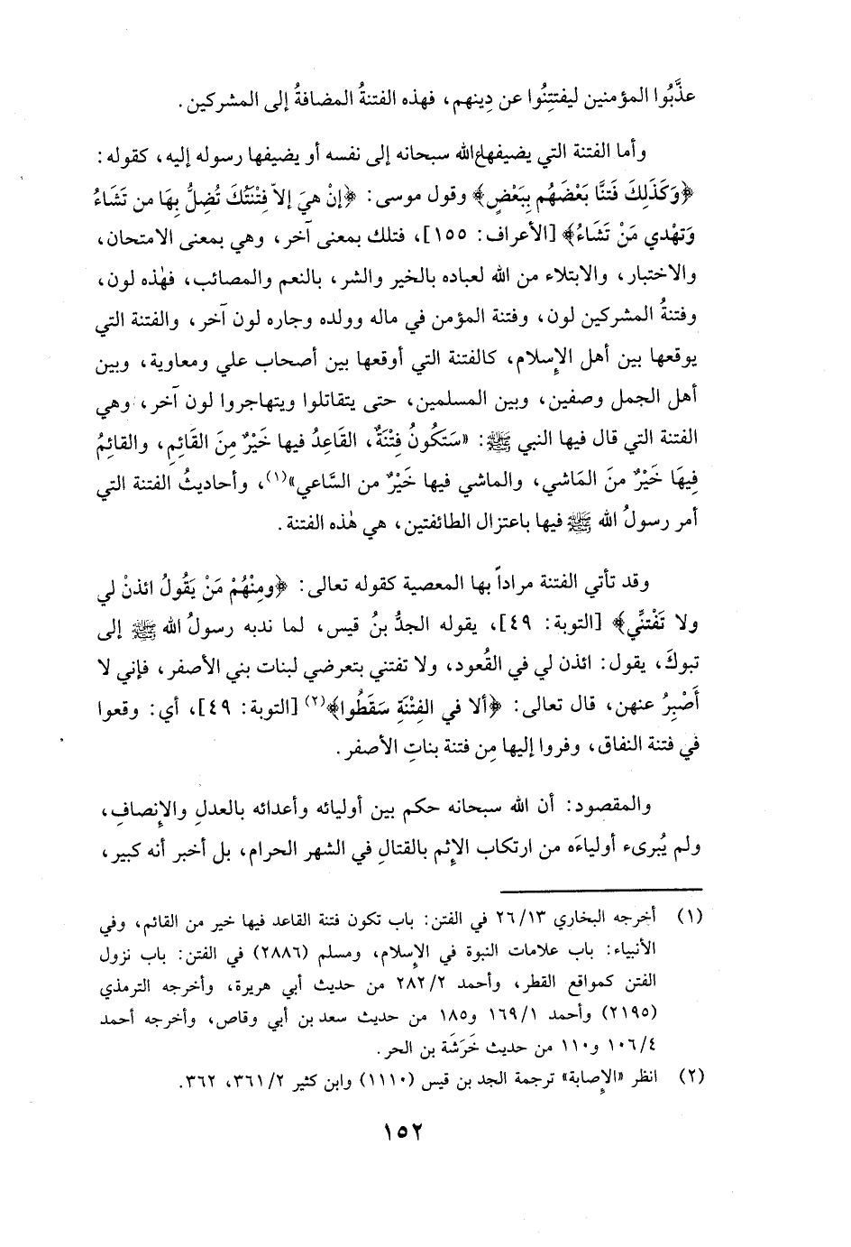 وَأَمَّا الْفِتْنَةُ الَّتِي يُضِيفُهَا اللَّهُ سُبْحَانَهُ إِلَى نَفْسِهِ، أَوْ يُضِيفُهَا رَسُولُهُ إِلَيْهِ كَقَوْلِهِ: {وَكَذَلِكَ فَتَنَّا بَعْضَهُمْ بِبَعْضٍ} [الأنعام: 53] ، وَقَوْلِ مُوسَى: {إِنْ هِيَ إِلَّا فِتْنَتُكَ تُضِلُّ بِهَا مَنْ تَشَاءُ وَتَهْدِي مَنْ تَشَاءُ} [الأعراف: 155] [الْأَعْرَافِ: 155] فَتِلْكَ بِمَعْنًى آخَرَ، وَهِيَ بِمَعْنَى الِامْتِحَانِ، وَالِاخْتِبَارِ، وَالِابْتِلَاءِ مِنَ اللَّهِ لِعِبَادِهِ بِالْخَيْرِ وَالشَّرِّ، بِالنِّعَمِ وَالْمَصَائِبِ، فَهَذِهِ لَوْنٌ، وَفِتْنَةُ الْمُشْرِكِينَ لَوْنٌ، وَفِتْنَةُ الْمُؤْمِنِ فِي مَالِهِ وَوَلَدِهِ وَجَارِهِ لَوْنٌ آخَرُ، وَالْفِتْنَةُ الَّتِي يُوقِعُهَا بَيْنَ أَهْلِ الْإِسْلَامِ كَالْفِتْنَةِ الَّتِي أَوْقَعَهَا بَيْنَ أَصْحَابِ علي ومعاوية، وَبَيْنَ أَهْلِ الْجَمَلِ وَصِفِّينَ، وَبَيْنَ الْمُسْلِمِينَ حَتَّى يَتَقَاتَلُوا، وَيَتَهَاجَرُوا لَوْنٌ آخَرُ، وَهِيَ الْفِتْنَةُ الَّتِي قَالَ فِيهَا النَّبِيُّ صَلَّى اللَّهُ عَلَيْهِ وَسَلَّمَ: ( «سَتَكُونُ فِتْنَةٌ الْقَاعِدُ فِيهَا خَيْرٌ مِنَ الْقَائِمِ، وَالْقَائِمُ فِيهَا خَيْرٌ مِنَ الْمَاشِي، وَالْمَاشِي فِيهَا خَيْرٌ مِنَ السَّاعِي» ) . وَأَحَادِيثُ الْفِتْنَةِ الَّتِي أَمَرَ رَسُولُ اللَّهِ صَلَّى اللَّهُ عَلَيْهِ وَسَلَّمَ فِيهَا بِاعْتِزَالِ الطَّائِفَتَيْنِ، هِيَ هَذِهِ الْفِتْنَةُ.