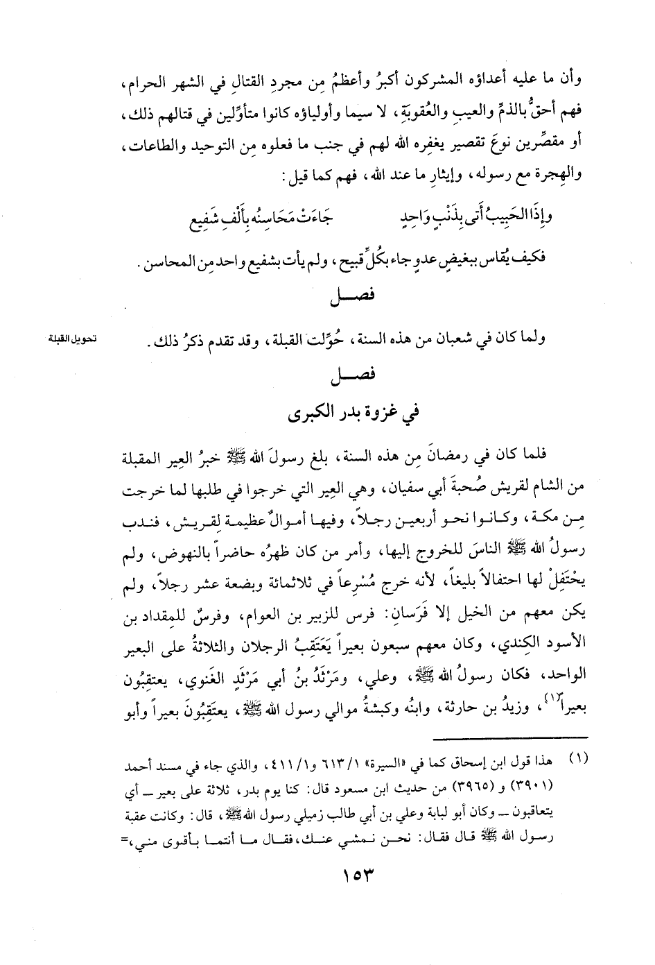 فَلَمَّا كَانَ فِي رَمَضَانَ مِنْ هَذِهِ السَّنَةِ بَلَغَ رَسُولَ اللَّهِ صَلَّى اللَّهُ عَلَيْهِ وَسَلَّمَ خَبَرُ الْعِيرِ الْمُقْبِلَةِ مِنَ الشَّامِ لِقُرَيْشٍ صُحْبَةَ أبي سفيان، وَهِيَ الْعِيرُ الَّتِي خَرَجُوا فِي طَلَبِهَا لَمَّا خَرَجَتْ مِنْ مَكَّةَ، وَكَانُوا نَحْوَ أَرْبَعِينَ رَجُلًا، وَفِيهَا أَمْوَالٌ عَظِيمَةٌ لِقُرَيْشٍ، فَنَدَبَ رَسُولُ اللَّهِ صَلَّى اللَّهُ عَلَيْهِ وَسَلَّمَ النَّاسَ لِلْخُرُوجِ إِلَيْهَا، وَأَمَرَ مَنْ كَانَ ظَهْرُهُ حَاضِرًا بِالنُّهُوضِ، وَلَمْ يَحْتَفِلْ لَهَا احْتِفَالًا بَلِيغًا؛ لِأَنَّهُ خَرَجَ مُسْرِعًا فِي ثَلَاثِمِائَةٍ وَبِضْعَةَ عَشَرَ رَجُلًا، وَلَمْ يَكُنْ مَعَهُمْ مِنَ الْخَيْلِ إِلَّا فَرَسَانِ: فَرَسٌ لِلزُّبَيْرِ بْنِ الْعَوَّامِ، وَفَرَسٌ للمقداد بن الأسود الكندي، وَكَانَ مَعَهُمْ سَبْعُونَ بَعِيرًا يَعْتَقِبُ الرَّجُلَانِ وَالثَّلَاثَةُ عَلَى الْبَعِيرِ الْوَاحِدِ، فَكَانَ رَسُولُ اللَّهِ صَلَّى اللَّهُ عَلَيْهِ وَسَلَّمَ، وعلي، ومرثد بن أبي مرثد الغنوي يَعْتَقِبُونَ بَعِيرًا، وَزَيْدُ بْنُ حَارِثَةَ وَابْنُهُ وكبشة موالي رسول الله صَلَّى اللَّهُ عَلَيْهِ وَسَلَّمَ يَعْتَقِبُونَ بَعِيرًا،