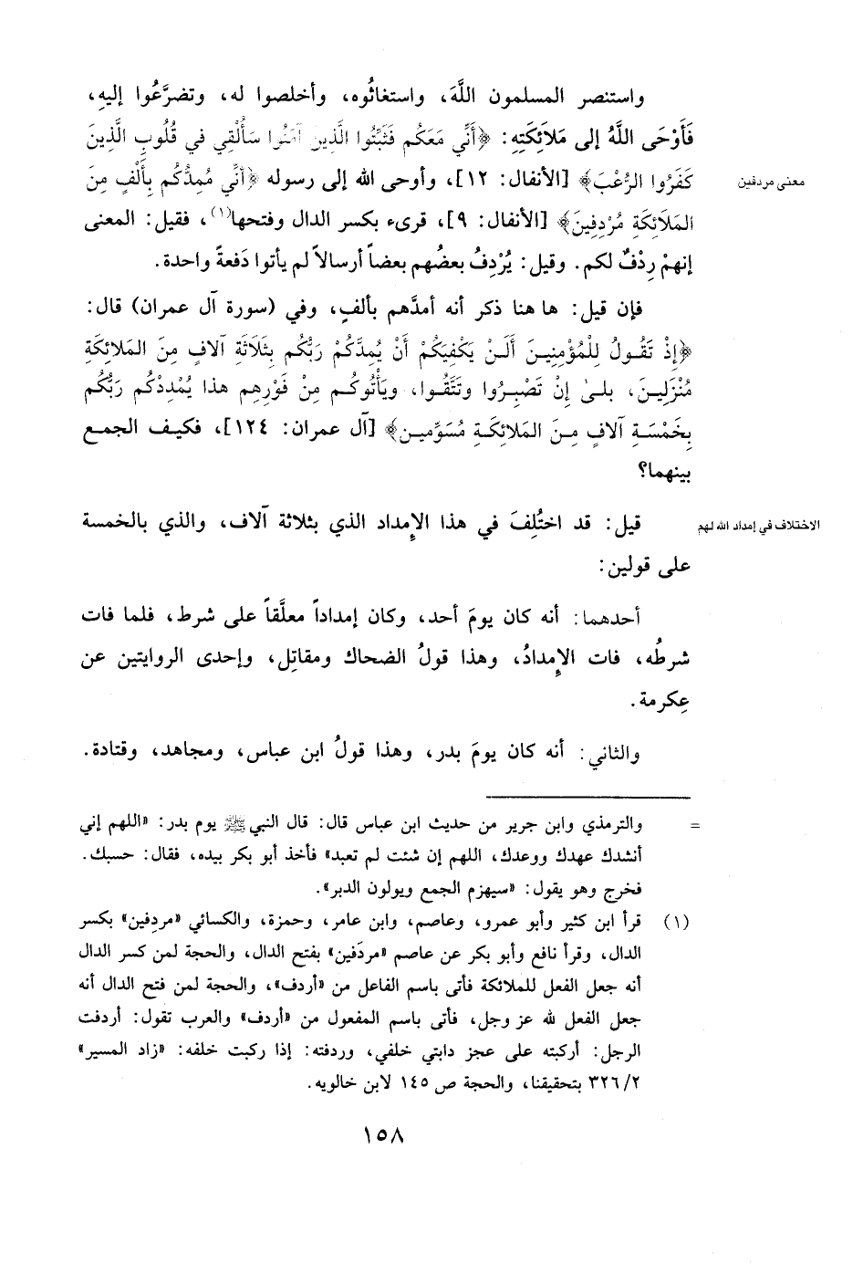 وَاسْتَنْصَرَ الْمُسْلِمُونَ اللَّهَ، وَاسْتَغَاثُوهُ، وَأَخْلَصُوا لَهُ، وَتَضَرَّعُوا إِلَيْهِ، فَأَوْحَى اللَّهُ إِلَى مَلَائِكَتِهِ: {أَنِّي مَعَكُمْ فَثَبِّتُوا الَّذِينَ آمَنُوا سَأُلْقِي فِي قُلُوبِ الَّذِينَ كَفَرُوا الرُّعْبَ} [الأنفال: 12] [الْأَنْفَالِ: 12] ، وَأَوْحَى اللَّهُ إِلَى رَسُولِهِ: {أَنِّي مُمِدُّكُمْ بِأَلْفٍ مِنَ الْمَلَائِكَةِ مُرْدِفِينَ} [الأنفال: 9] [الْأَنْفَالِ: 9] ، قُرِئَ بِكَسْرِ الدَّالِ وَفَتْحِهَا، فَقِيلَ: الْمَعْنَى إِنَّهُمْ رِدْفٌ لَكُمْ. وَقِيلَ: يُرْدِفُ بَعْضُهُمْ بَعْضًا أَرْسَالًا لَمْ يَأْتُوا دَفْعَةً وَاحِدَةً.