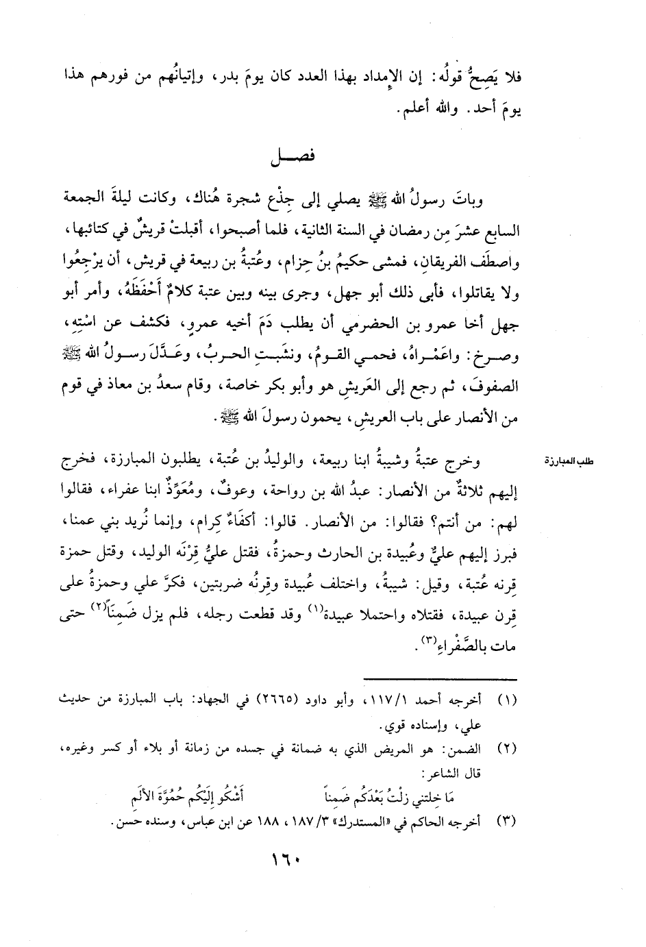 وَخَرَجَ عتبة وشيبة ابْنَا ربيعة، وَالْوَلِيدُ بْنُ عُتْبَةَ، يَطْلُبُونَ الْمُبَارَزَةَ، فَخَرَجَ إِلَيْهِمْ ثَلَاثَةٌ مِنَ الْأَنْصَارِ: عَبْدُ اللَّهِ بْنُ رَوَاحَةَ، وعوف ومعوذ ابْنَا عفراء، فَقَالُوا لَهُمْ: مَنْ أَنْتُمْ؟ فَقَالُوا: مِنَ الْأَنْصَارِ. قَالُوا: أَكْفَاءٌ كِرَامٌ، وَإِنِّمَا نُرِيدُ بَنِي عَمِّنَا، فَبَرَزَ إِلَيْهِمْ علي وَعُبَيْدَةُ بْنُ الْحَارِثِ وحمزة، فَقَتَلَ علي قِرْنَهُ الوليد، وَقَتَلَ حمزة قِرْنَهُ عتبة، وَقِيلَ: شيبة، وَاخْتَلَفَ عبيدة وَقِرْنُهُ ضَرْبَتَيْنِ، فَكَرَّ علي وحمزة عَلَى قِرْنِ عبيدة، فَقَتَلَاهُ وَاحْتَمَلَا عبيدة وَقَدْ قُطِعَتْ رِجْلُهُ فَلَمْ يَزَلْ ضَمِنًا حَتَّى مَاتَ بِالصَّفْرَاءِ.