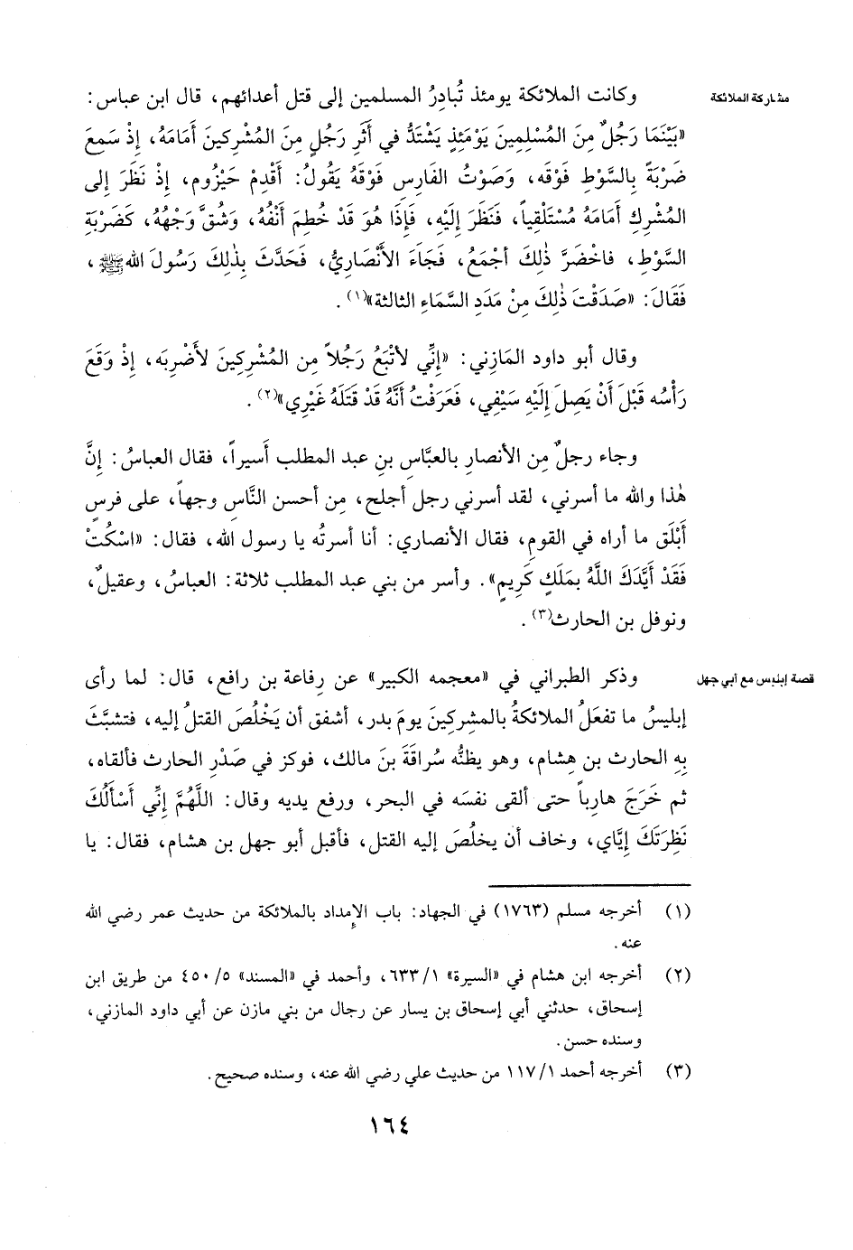 ( «وَجَاءَ رَجُلٌ مِنَ الْأَنْصَارِ بِالْعَبَّاسِ بْنِ عَبْدِ الْمُطَّلِبِ أَسِيرًا، فَقَالَ العباس: إِنَّ هَذَا وَاللَّهِ مَا أَسَرَنِي، لَقَدْ أَسَرَنِي رَجُلٌ أَجْلَحُ، مِنْ أَحْسَنِ النَّاسِ وَجْهًا، عَلَى فَرَسٍ أَبْلَقَ مَا أَرَاهُ فِي الْقَوْمِ، فَقَالَ الْأَنْصَارِيُّ: أَنَا أَسَرْتُهُ يَا رَسُولَ اللَّهِ، فَقَالَ: " اسْكُتْ فَقَدْ أَيَّدَكَ اللَّهُ بِمَلَكٍ كَرِيمٍ» ) . وَأُسِرَ مِنْ بَنِي عَبْدِ الْمُطَّلِبِ ثَلَاثَةٌ: العباس، وعقيل، وَنَوْفَلُ بْنُ الْحَارِثِ.