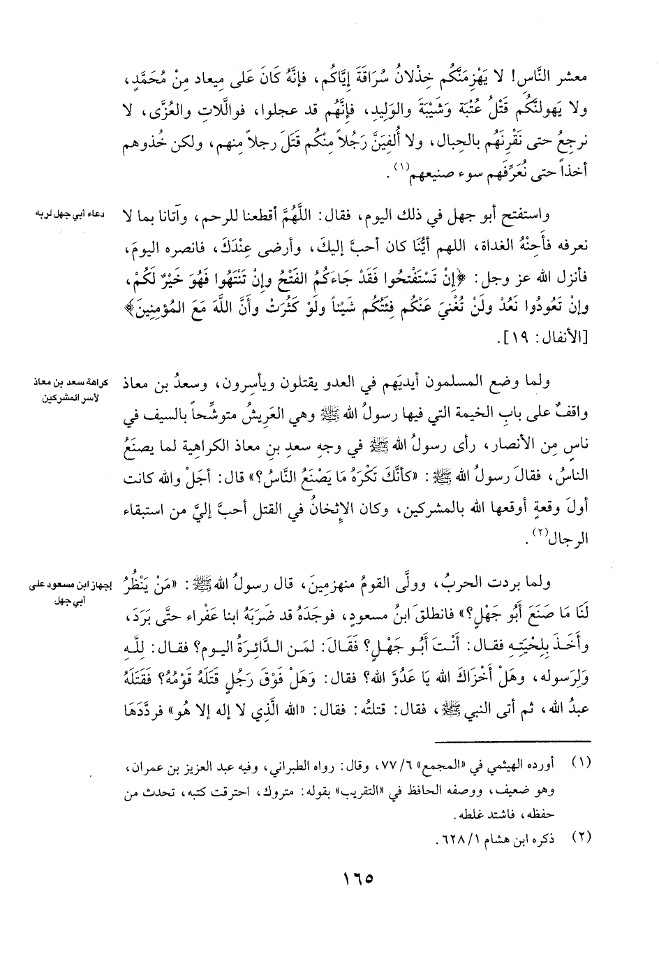 مَعْشَرَ النَّاسِ! لَا يَهْزِمَنَّكُمْ خِذْلَانُ سراقة إِيَّاكُمْ، فَإِنَّهُ كَانَ عَلَى ميعاد مِنْ مُحَمَّدٍ، وَلَا يَهُولَنَّكُمْ قَتْلُ عتبة وشيبة والوليد فَإِنَّهُمْ قَدْ عُجِّلُوا، فَوَاللَّاتِ وَالْعُزَّى، لَا نَرْجِعُ حَتَّى نَقْرِنَهُمْ بِالْحِبَالِ، وَلَا أُلْفِيَنَّ رَجُلًا مِنْكُمْ قَتَلَ رَجُلًا مِنْهُمْ، وَلَكِنْ خُذُوهُمْ أَخْذًا حَتَّى نُعَرِّفَهُمْ سُوءَ صَنِيعِهِمْ) .
