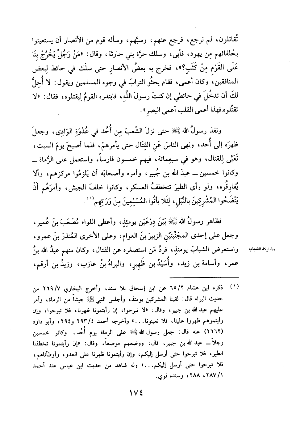 وَنَفَذَ رَسُولُ اللَّهِ صَلَّى اللَّهُ عَلَيْهِ وَسَلَّمَ حَتَّى نَزَلَ الشِّعْبَ مِنْ أُحُدٍ فِي عُدْوَةِ الْوَادِي، وَجَعَلَ ظَهْرَهُ إِلَى أُحُدٍ، وَنَهَى النَّاسَ عَنِ الْقِتَالِ حَتَّى يَأْمُرَهُمْ، فَلَمَّا أَصْبَحَ يَوْمَ السَّبْتِ، تَعَبَّى لِلْقِتَالِ، وَهُوَ فِي سَبْعِمِائَةٍ، فِيهِمْ خَمْسُونَ فَارِسًا، وَاسْتَعْمَلَ عَلَى الرُّمَاةِ - وَكَانُوا خَمْسِينَ - عَبْدَ اللَّهِ بْنَ جُبَيْرٍ، وَأَمَرَهُ وَأَصْحَابَهُ أَنْ يَلْزَمُوا مَرْكَزَهُمْ، وَأَلَّا يُفَارِقُوهُ، وَلَوْ رَأَى الطَّيْرَ تَتَخَطَّفُ الْعَسْكَرَ، وَكَانُوا خَلْفَ الْجَيْشِ، وَأَمَرَهُمْ أَنْ يَنْضَحُوا الْمُشْرِكِينَ بِالنَّبْلِ، لِئَلَّا يَأْتُوا الْمُسْلِمِينَ مِنْ وَرَائِهِمْ.