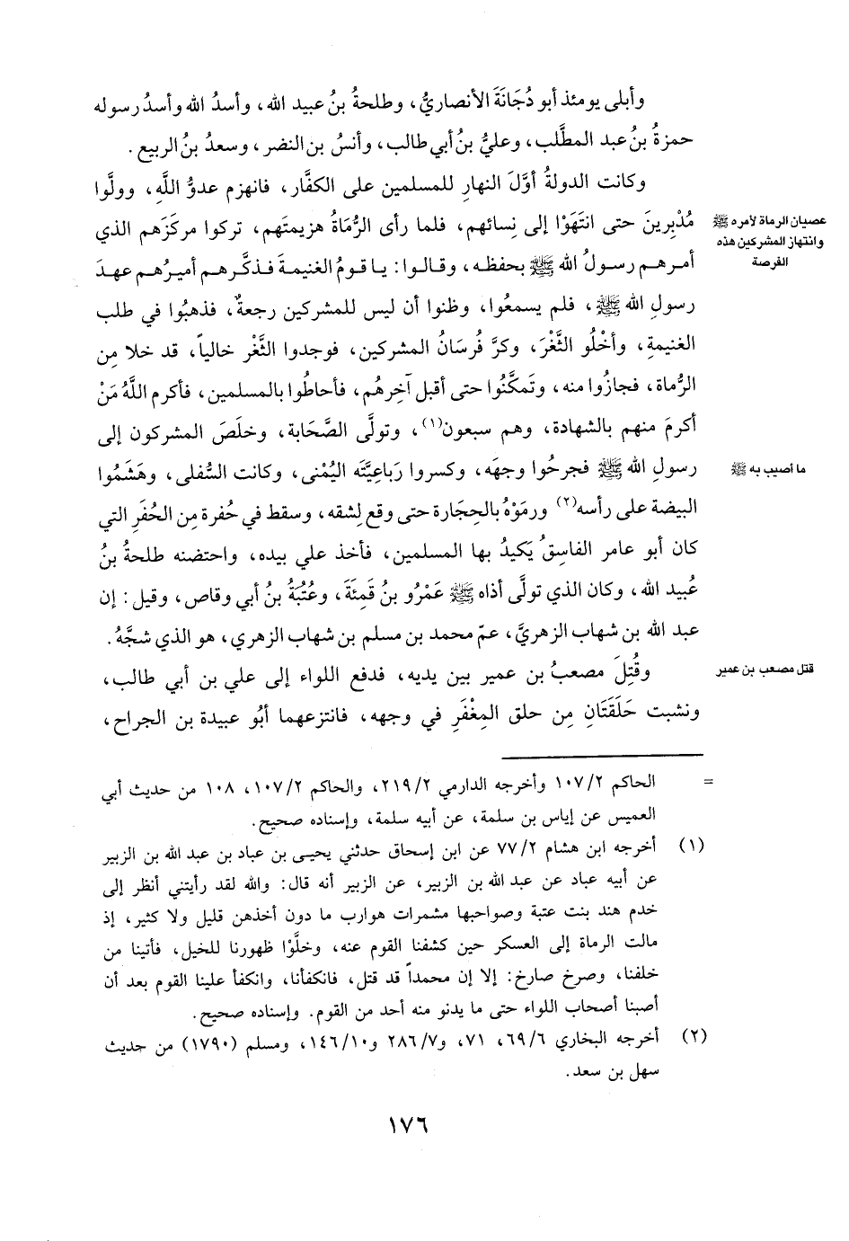 وَقُتِلَ مُصْعَبُ بْنُ عُمَيْرٍ بَيْنَ يَدَيْهِ، فَدَفَعَ اللِّوَاءَ إِلَى عَلِيِّ بْنِ أَبِي طَالِبٍ، وَنَشِبَتْ حَلْقَتَانِ مِنْ حِلَقِ الْمِغْفَرِ فِي وَجْهِهِ، فَانْتَزَعَهُمَا أَبُو عُبَيْدَةَ بْنُ الْجَرَّاحِ