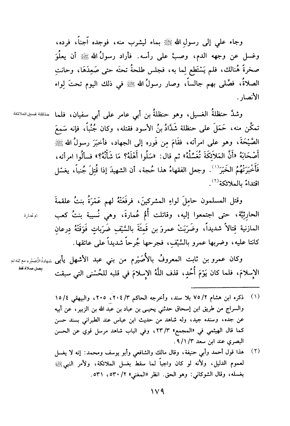 وَشَدَّ حنظلة الْغَسِيلُ، وَهُوَ حنظلة بن أبي عامر عَلَى أبي سفيان، فَلَمَّا تَمَكَّنَ مِنْهُ حَمَلَ عَلَى حنظلة شداد بن الأسود فَقَتَلَهُ، ( «وَكَانَ جُنُبًا فَإِنَّهُ سَمِعَ الصَّيْحَةَ وَهُوَ عَلَى امْرَأَتِهِ، فَقَامَ مِنْ فَوْرِهِ إِلَى الْجِهَادِ، فَأَخْبَرَ رَسُولُ اللَّهِ صَلَّى اللَّهُ عَلَيْهِ وَسَلَّمَ أَصْحَابَهُ " أَنَّ الْمَلَائِكَةَ تُغَسِّلُهُ " ثُمَّ قَالَ: " سَلُوا أَهْلَهُ؟ مَا شَأْنُهُ؟ " فَسَأَلُوا امْرَأَتَهُ، فَأَخْبَرَتْهُمُ الْخَبَرَ» ) . وَجَعَلَ الْفُقَهَاءُ هَذَا حُجَّةً، أَنَّ الشَّهِيدَ إِذَا قُتِلَ جُنُبًا، يُغَسَّلُ اقْتِدَاءً بِالْمَلَائِكَةِ.