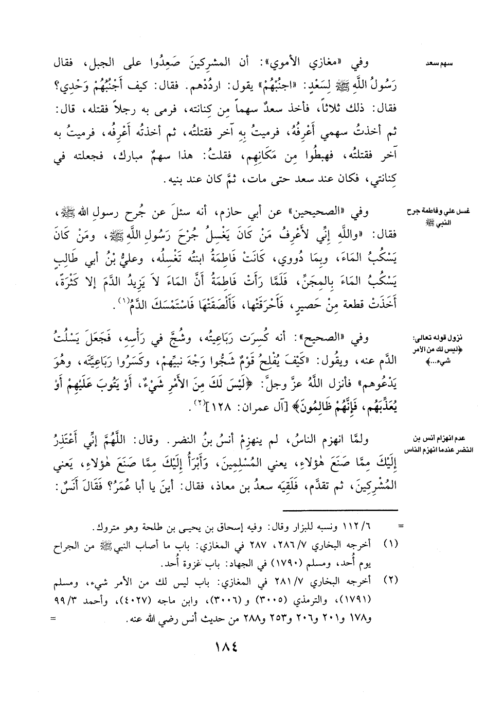 وَفِي " الصَّحِيحَيْنِ " عَنْ أبي حازم، أَنَّهُ سُئِلَ عَنْ جُرْحِ رَسُولِ اللَّهِ صَلَّى اللَّهُ عَلَيْهِ وَسَلَّمَ، فَقَالَ: ( «وَاللَّهِ إِنِّي لَأَعْرِفُ مَنْ كَانَ يَغْسِلُ جُرْحَ رَسُولِ اللَّهِ صَلَّى اللَّهُ عَلَيْهِ وَسَلَّمَ، وَمَنْ كَانَ يَسْكُبُ الْمَاءَ، وَبِمَا دُووِيَ، كَانَتْ فاطمة ابْنَتُهُ تَغْسِلُهُ، وَعَلِيُّ بْنُ أَبِي طَالِبٍ يَسْكُبُ الْمَاءَ بِالْمِجَنِّ، فَلَمَّا رَأَتْ فاطمة أَنَّ الْمَاءَ لَا يَزِيدُ الدَّمَ إِلَّا كَثْرَةً، أَخَذَتْ قِطْعَةً مِنْ حَصِيرٍ، فَأَحْرَقَتْهَا، فَأَلْصَقَتْهَا فَاسْتَمْسَكَ الدَّمُ» ) .