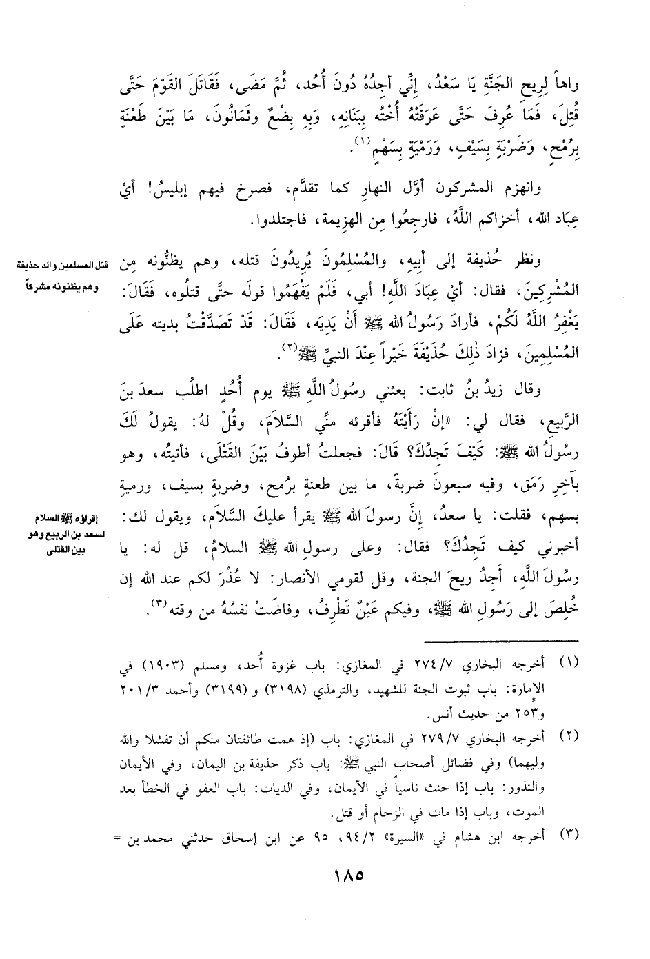 ( «وَقَالَ زَيْدُ بْنُ ثَابِتٍ: بَعَثَنِي رَسُولُ اللَّهِ صَلَّى اللَّهُ عَلَيْهِ وَسَلَّمَ يَوْمَ أُحُدٍ أَطْلُبُ سَعْدَ بْنَ الرَّبِيعِ، فَقَالَ لِي: إِنْ رَأَيْتَهُ فَأَقْرِئْهُ مِنِّي السَّلَامَ، وَقُلْ لَهُ: يَقُولُ لَكَ رَسُولُ اللَّهِ صَلَّى اللَّهُ عَلَيْهِ وَسَلَّمَ كَيْفَ تَجِدُكَ؟ قَالَ: فَجَعَلْتُ أَطُوفُ بَيْنَ الْقَتْلَى فَأَتَيْتُهُ، وَهُوَ بِآخِرِ رَمَقٍ، وَفِيهِ سَبْعُونَ ضَرْبَةً، مَا بَيْنَ طَعْنَةٍ بِرُمْحٍ، وَضَرْبَةٍ بِسَيْفٍ، وَرَمْيَةٍ بِسَهْمٍ، فَقُلْتُ: يَا سعد، إِنَّ رَسُولَ اللَّهِ صَلَّى اللَّهُ عَلَيْهِ وَسَلَّمَ يَقْرَأُ عَلَيْكَ السَّلَامَ، وَيَقُولُ لَكَ: أَخْبِرْنِي كَيْفَ تَجِدُكَ؟ فَقَالَ: وَعَلَى رَسُولِ اللَّهِ صَلَّى اللَّهُ عَلَيْهِ وَسَلَّمَ السَّلَامُ، قُلْ لَهُ: يَا رَسُولَ اللَّهِ، أَجِدُ رِيحَ الْجَنَّةِ، وَقُلْ لِقَوْمِيَ الْأَنْصَارِ: لَا عُذْرَ لَكُمْ عِنْدَ اللَّهِ إِنْ خُلِصَ إِلَى رَسُولِ اللَّهِ صَلَّى اللَّهُ عَلَيْهِ وَسَلَّمَ وَفِيكُمْ عَيْنٌ تَطْرِفُ، وَفَاضَتْ نَفْسُهُ مِنْ وَقْتِهِ» ) .