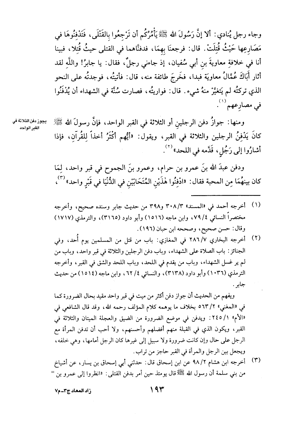وَمِنْهَا: جَوَازُ دَفْنِ الرَّجُلَيْنِ أَوِ الثَّلَاثَةِ فِي الْقَبْرِ الْوَاحِدِ، فَإِنَّ رَسُولَ اللَّهِ صَلَّى اللَّهُ عَلَيْهِ وَسَلَّمَ ( «كَانَ يَدْفِنُ الرَّجُلَيْنِ وَالثَّلَاثَةَ فِي الْقَبْرِ، وَيَقُولُ: أَيُّهُمْ أَكْثَرُ أَخْذًا لِلْقُرْآنِ، فَإِذَا أَشَارُوا إِلَى رَجُلٍ قَدَّمَهُ فِي اللَّحْدِ» ) .