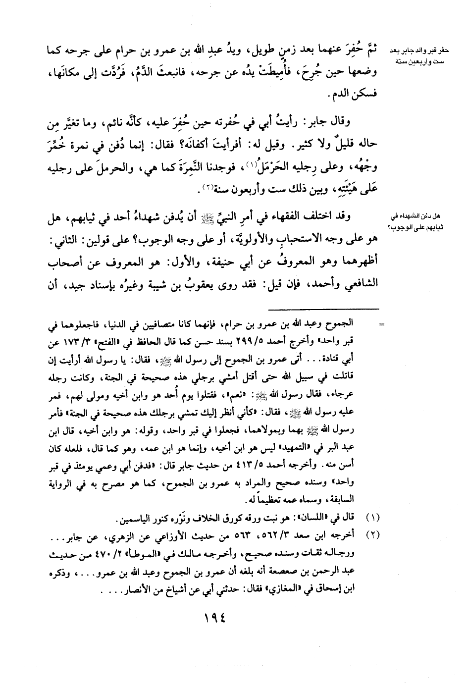 وَقَالَ جابر: (رَأَيْتُ أَبِي فِي حُفْرَتِهِ حِينَ حُفِرَ عَلَيْهِ كَأَنَّهُ نَائِمٌ، وَمَا تَغَيَّرَ مِنْ حَالِهِ قَلِيلٌ وَلَا كَثِيرٌ. وَقِيلَ لَهُ: أَفَرَأَيْتَ أَكْفَانَهُ؟ فَقَالَ: إِنَّمَا دُفِنَ فِي نَمِرَةٍ، خُمِّرَ وَجْهُهُ، وَعَلَى رِجْلَيْهِ الْحَرْمَلُ، فَوَجَدْنَا النَّمِرَةَ كَمَا هِيَ، وَالْحَرْمَلُ عَلَى رِجْلَيْهِ عَلَى هَيْئَتِهِ، وَبَيْنَ ذَلِكَ سِتٌّ وَأَرْبَعُونَ سَنَةً) .