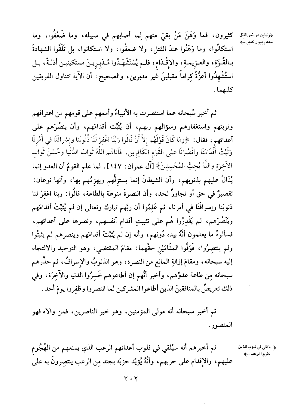 لَمَّا عَلِمَ الْقَوْمُ أَنَّ الْعَدُوَّ إنَّمَا يُدَالُ عَلَيْهِمْ بِذُنُوبِهِمْ، وَأَنَّ الشّيْطَانَ إنَّمَا يَسْتَزِلُّهُمْ وَيَهْزِمُهُمْ بِهَا، وَأَنَّهَا نَوْعَانِ: تَقْصِيرٌ فِي حَقٍّ، أَوْ تَجَاوُزٌ لِحَدٍّ، وَأَنَّ النَّصْرَةَ مَنُوطَةٌ بِالطَّاعَةِ، قَالُوا: رَبَّنَا اغْفِرْ لَنَا ذُنُوبَنَا، وَإِسْرَافَنَا فِي أَمْرِنَا، ثُمَّ عَلِمُوا أَنَّ رَبَّهُمْ تَبَارَكَ وَتَعَالَى إنْ لَمْ يُثَبِّتْ أَقْدَامَهُمْ وَيَنْصُرْهُمْ لَمْ يَقْدِرُوا هُمْ عَلَى تَثْبِيتِ أَقْدَامِ أَنْفُسِهِمْ وَنَصْرِهَا عَلَى أَعْدَائِهِمْ، فَسَأَلُوهُ مَا يَعْلَمُونَ أَنَّهُ بِيَدِهِ دُونَهُمْ، وَأَنّهُ إنْ لَمْ يُثَبِّتْ أَقْدَامَهُمْ وَيَنْصُرْهُمْ لَمْ يَثْبُتُوا وَلَمْ يَنْتَصِرُوا، فَوَفَّوُا الْمَقَامَيْنِ حَقَّهُمَا: مَقَامَ الْمُقْتَضِي، وَهُوَ التَّوْحِيدُ وَالِالْتِجَاءُ إِلَيْهِ سُبْحَانَهُ، وَمَقَامَ إزَالَةِ الْمَانِعِ مِنَ النَّصْرَةِ، وَهُوَ الذُّنُوبُ وَالْإِسْرَافُ، ثُمَّ حَذَّرَهُمْ سُبْحَانَهُ مِنْ طَاعَةِ عَدُوِّهِمْ، وَأَخْبَرَ أَنَّهُمْ إنْ أَطَاعُوهُمْ خَسِرُوا الدُّنْيَا وَالْآخِرَةَ، وَفِي ذَلِكَ تَعْرِيضٌ بِالْمُنَافِقِينَ الَّذِينَ أَطَاعُوا الْمُشْرِكِينَ لَمَّا انْتَصَرُوا وَظَفِرُوا يَوْمَ أُحُدٍ.