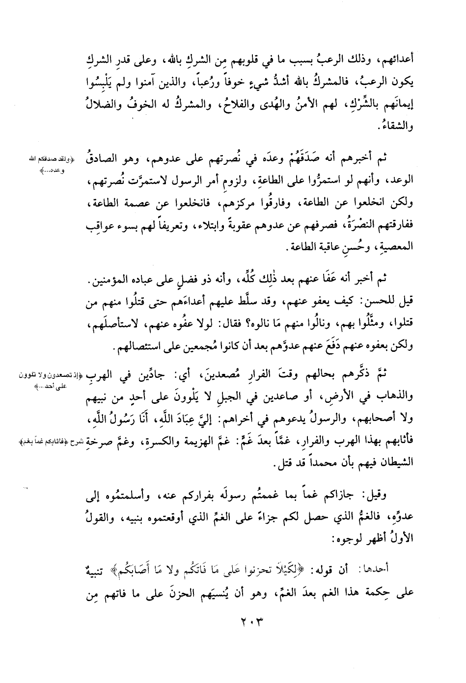 ثُمَّ ذَكَّرَهُمْ بِحَالِهِمْ وَقْتَ الْفِرَارِ مُصْعِدِينَ أَيْ جَادِّينَ فِي الْهَرَبِ وَالذِّهَابِ فِي الْأَرْضِ، أَوْ صَاعِدِينَ فِي الْجَبَلِ لَا يَلْوُونَ عَلَى أَحَدٍ مِنْ نَبِيِّهِمْ وَلَا أَصْحَابِهِمْ، وَالرَّسُولُ يَدْعُوهُمْ فِي أُخْرَاهُمْ إِلَى عِبَادِ اللَّهِ أَنَا رَسُولُ اللَّهِ.
