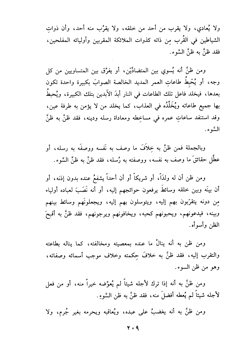 وَمَنْ ظَنَّ أَنَّهُ يُسَوِّي بَيْنَ الْمُتَضَادَّيْنِ، أَوْ يُفَرِّقُ بَيْنَ الْمُتَسَاوِيَيْنِ مِنْ كُلِّ وَجْهٍ أَوْ يُحْبِطُ طَاعَاتِ الْعُمُرِ الْمَدِيدِ الْخَالِصَةِ الصَّوَابِ بِكَبِيرَةٍ وَاحِدَةٍ تَكُونُ بَعْدَهَا، فَيَخْلُدُ فَاعِلُ تِلْكَ الطَّاعَاتِ فِي النَّارِ أَبَدَ الْآبِدِينَ بِتِلْكَ الْكَبِيرَةِ، وَيُحْبِطُ بِهَا جَمِيعَ طَاعَاتِهِ، وَيُخَلِّدُهُ فِي الْعَذَابِ كَمَا يُخَلِّدُ مَنْ لَا يُؤْمِنُ بِهِ طَرْفَةَ عَيْنٍ، وَقَدِ اسْتَنْفَدَ سَاعَاتِ عُمُرِهِ فِي مَسَاخِطِهِ وَمُعَادَاةِ رُسُلِهِ وَدِينِهِ فَقَدْ ظَنَّ بِهِ ظَنَّ السَّوْءِ.