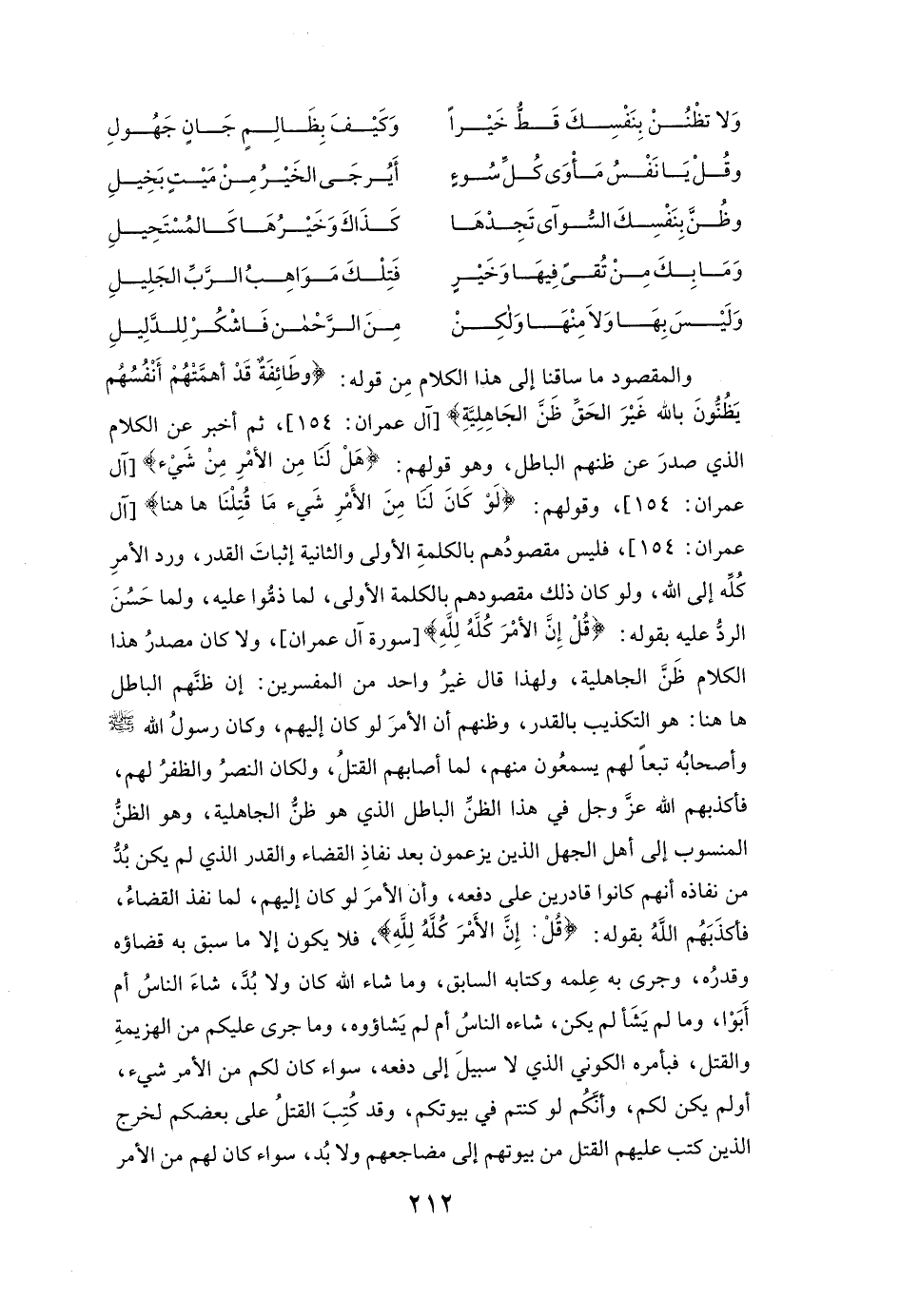 وَالْمَقْصُودِ مَا سَاقَنَا إِلَى هَذَا الْكَلَامِ مِنْ قَوْلِهِ: {وَطَائِفَةٌ قَدْ أَهَمَّتْهُمْ أَنْفُسُهُمْ يَظُنُّونَ بِاللَّهِ غَيْرَ الْحَقِّ ظَنَّ الْجَاهِلِيَّةِ} [آل عمران: 154] [آلِ عِمْرَانَ: 154] ، ثُمَّ أَخْبَرَ عَنِ الْكَلَامِ الَّذِي صَدَرَ عَنْ ظَنِّهِمُ الْبَاطِلِ وَهُوَ قَوْلُهُمْ: {هَلْ لَنَا مِنَ الْأَمْرِ مِنْ شَيْءٍ} [آل عمران: 154] [آلِ عِمْرَانَ: 154] ، وَقَوْلُهُمْ: {لَوْ كَانَ لَنَا مِنَ الْأَمْرِ شَيْءٌ مَا قُتِلْنَا هَاهُنَا} [آل عمران: 154] [آلِ عِمْرَانَ: 154] ، فَلَيْسَ مَقْصُودُهُمْ بِالْكَلِمَةِ الْأُولَى وَالثَّانِيَةِ إثْبَاتَ الْقَدَرِ وَرَدَّ الْأَمْرِ كُلِّهِ إلَى اللَّهِ، وَلَوْ كَانَ ذَلِكَ مَقْصُودَهُمْ بِالْكَلِمَةِ الْأُولَى لَمَا ذُمُّوا عَلَيْهِ، وَلَمَا حَسُنَ الرَّدُّ عَلَيْهِ بِقَوْلِهِ: {قُلْ إِنَّ الْأَمْرَ كُلَّهُ لِلَّهِ} [آل عمران: 154] . [سُورَةُ آلِ عِمْرَانَ] ، وَلَا كَانَ مَصْدَرُ هَذَا الْكَلَامِ ظَنَّ الْجَاهِلِيَّةِ، وَلِهَذَا قَالَ غَيْرُ وَاحِدٍ مِنَ الْمُفَسِّرِينَ: إنَّ ظَنَّهُمُ الْبَاطِلَ هَاهُنَا: هُوَ التَّكْذِيبُ بِالْقَدَرِ وَظَنُّهُمْ أَنَّ الْأَمْرَ لَوْ كَانَ إلَيْهِمْ وَكَانَ رَسُولُ اللَّهِ صَلَّى اللَّهُ عَلَيْهِ وَسَلَّمَ وَأَصْحَابُهُ تَبَعًا لَهُمْ يَسْمَعُونَ مِنْهُمْ لَمَا أَصَابَهُمُ الْقَتْلُ، وَلَكَانَ النَّصْرُ وَالظَّفَرُ لَهُمْ فَأَكْذَبَهُمُ اللَّهُ عَزَّ وَجَلَّ فِي هَذَا الظَّنِّ الْبَاطِلِ الَّذِي هُوَ ظَنُّ الْجَاهِلِيَّةِ، وَهُوَ الظَّنُّ الْمَنْسُوبُ إِلَى أَهْلِ الْجَهْلِ الَّذِينَ يَزْعُمُونَ بَعْدَ نَفَاذِ الْقَضَاءِ وَالْقَدَرِ الَّذِي لَمْ يَكُنْ بُدٌّ مِنْ نَفَاذِهِ أَنَّهُمْ كَانُوا قَادِرِينَ عَلَى دَفْعِهِ، وَأَنَّ الْأَمْرَ لَوْ كَانَ إلَيْهِمْ لَمَا نَفَذَ الْقَضَاءُ، فَأَكْذَبَهُمُ اللَّهُ بِقَوْلِهِ: {قُلْ إِنَّ الْأَمْرَ كُلَّهُ لِلَّهِ} [آل عمران: 154] ، فَلَا يَكُونُ إلَّا مَا سَبَقَ بِهِ قَضَاؤُهُ وَقَدَرُهُ، وَجَرَى بِهِ عِلْمُهُ وَكِتَابُهُ السَّابِقُ، وَمَا شَاءَ اللَّهُ كَانَ، وَلَا بُدَّ، شَاءَ النَّاسُ أَمْ أَبَوْا، وَمَا لَمْ يَشَأْ لَمْ يَكُنْ، شَاءَهُ النّاسُ أَمْ لَمْ يَشَاءُوهُ، وَمَا جَرَى عَلَيْكُمْ مِنَ الْهَزِيمَةِ وَالْقَتْلِ فَبِأَمْرِهِ الْكَوْنِيِّ الَّذِي لَا سَبِيلَ إِلَى دَفْعِهِ، سَوَاءٌ كَانَ لَكُمْ مِنَ الْأَمْرِ شَيْءٌ أَوْ لَمْ يَكُنْ لَكُمْ، وَأَنَّكُمْ لَوْ كُنْتُمْ فِي بُيُوتِكُمْ وَقَدْ كُتِبَ الْقَتْلُ عَلَى بَعْضِكُمْ لَخَرَجَ الَّذِينَ كُتِبَ عَلَيْهِمُ الْقَتْلُ مِنْ بُيُوتِهِمْ إِلَى مَضَاجِعِهِمْ وَلَا بُدَّ، سَوَاءٌ كَانَ لَهُمْ مِنَ الْأَمْرِ