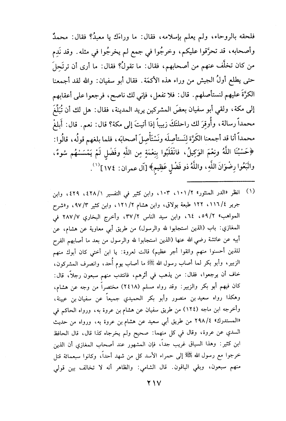 فَلَحِقَهُ بِالرَّوْحَاءِ، وَلَمْ يَعْلَمْ بِإِسْلَامِهِ، فَقَالَ مَا وَرَاءَكَ يَا معبد؟ فَقَالَ: مُحَمَّدٌ وَأَصْحَابُهُ قَدْ تَحَرَّقُوا عَلَيْكُمْ، وَخَرَجُوا فِي جَمْعٍ لَمْ يَخْرُجُوا فِي مِثْلِهِ، وَقَدْ نَدِمَ مَنْ كَانَ تَخَلَّفَ عَنْهُمْ مِنْ أَصْحَابِهِمْ، فَقَالَ: مَا تَقُولُ؟ فَقَالَ: مَا أَرَى أَنْ تَرْتَحِلَ حَتَّى يَطْلُعَ أَوَّلُ الْجَيْشِ مِنْ وَرَاءِ هَذِهِ الْأَكَمَةِ. فَقَالَ أبو سفيان: وَاللَّهِ لَقَدْ أَجْمَعْنَا الْكَرَّةَ عَلَيْهِمْ لِنَسْتَأْصِلَهُمْ. قَالَ: فَلَا تَفْعَلْ فَإِنِّي لَكَ نَاصِحٌ، فَرَجَعُوا عَلَى أَعْقَابِهِمْ إِلَى مَكَّةَ، وَلَقِيَ أبو سفيان بَعْضَ الْمُشْرِكِينَ يُرِيدُ الْمَدِينَةَ، فَقَالَ: هَلْ لَكَ أَنْ تُبْلِغَ مُحَمَّدًا رِسَالَةً وَأُوقِرَ لَكَ رَاحِلَتَكَ زَبِيبًا إذَا أَتَيْتَ إِلَى مَكَّةَ؟ قَالَ: نَعَمْ. قَالَ: أَبْلِغْ مُحَمَّدًا أَنَّا قَدْ أَجْمَعْنَا الْكَرَّةَ لِنَسْتَأْصِلَهُ، وَنَسْتَأْصِلَ أَصْحَابَهُ، فَلَمَّا بَلَغَهُمْ قَوْلُهُ، قَالُوا: {حَسْبُنَا اللَّهُ وَنِعْمَ الْوَكِيلُ فَانْقَلَبُوا بِنِعْمَةٍ مِنَ اللَّهِ وَفَضْلٍ لَمْ يَمْسَسْهُمْ سُوءٌ وَاتَّبَعُوا رِضْوَانَ اللَّهِ وَاللَّهُ ذُو فَضْلٍ عَظِيمٍ} [آل عمران: 173] [آلِ عِمْرَانَ: 174]