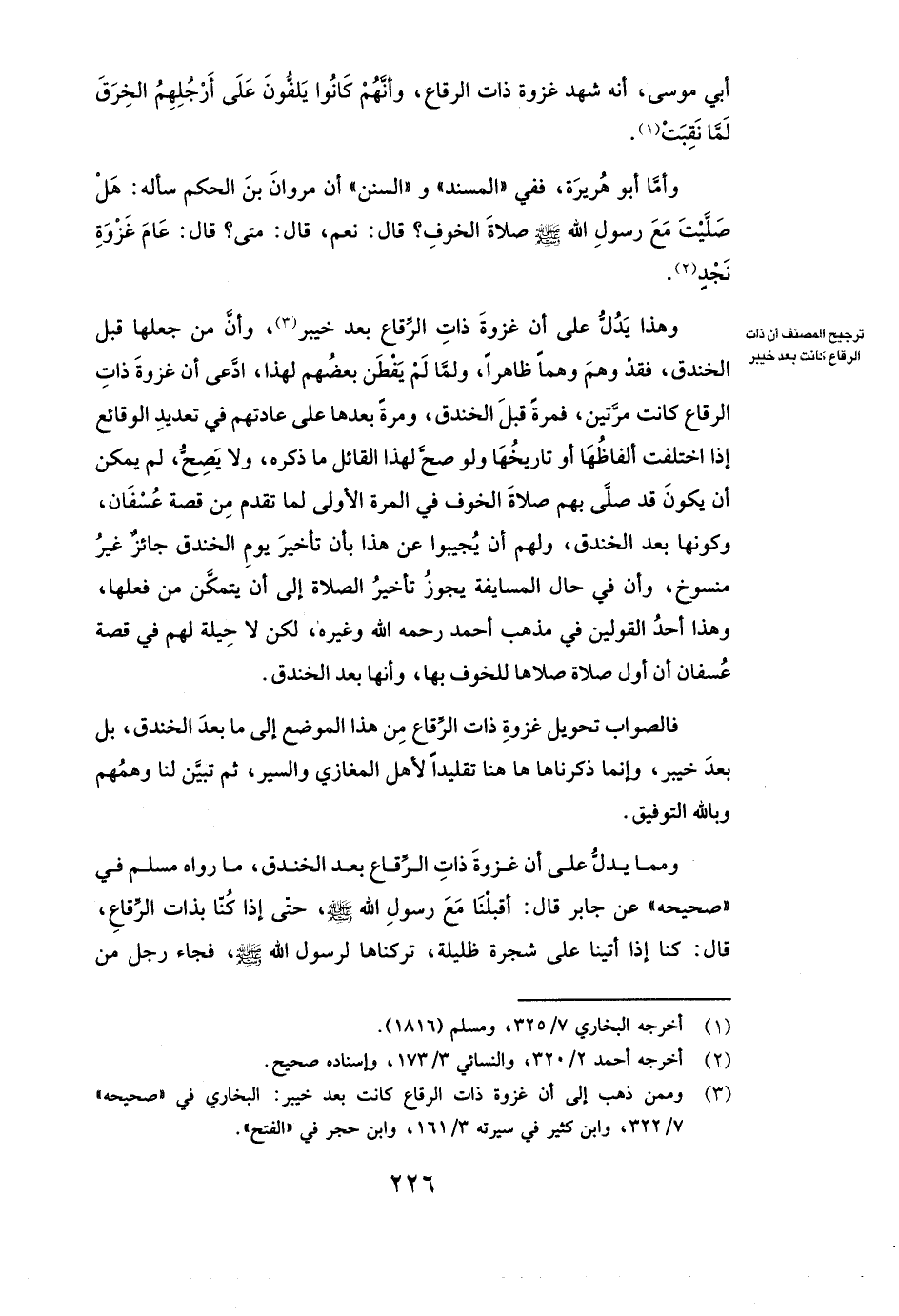 وَهَذَا يَدُلُّ عَلَى أَنَّ غَزْوَةَ ذَاتِ الرِّقَاعِ بَعْدَ خَيْبَرَ، وَأَنَّ مَنْ جَعَلَهَا قَبْلَ الْخَنْدَقِ فَقَدْ وَهِمَ وَهْمًا ظَاهِرًا، وَلَمَّا لَمْ يَفْطُنْ بَعْضُهُمْ لِهَذَا ادَّعَى أَنَّ غَزْوَةَ ذَاتِ الرِّقَاعِ كَانَتْ مَرَّتَيْنِ، فَمَرَّةً قَبْلَ الْخَنْدَقِ، وَمَرَّةً بَعْدَهَا عَلَى عَادَتِهِمْ فِي تَعْدِيدِ الْوَقَائِعِ إذَا اخْتَلَفَتْ أَلْفَاظُهَا أَوْ تَارِيخُهَا، وَلَوْ صَحَّ لِهَذَا الْقَائِلِ مَا ذَكَرَهُ، وَلَا يَصِحُّ لَمْ يُمْكِنْ أَنْ يَكُونَ قَدْ صَلَّى بِهِمْ صَلَاةَ الْخَوْفِ فِي الْمَرَّةِ الْأُولَى لِمَا تَقَدَّمَ مِنْ قِصَّةِ عُسْفَانَ، وَكَوْنِهَا بَعْدَ الْخَنْدَقِ، وَلَهُمْ أَنْ يُجِيبُوا عَنْ هَذَا بِأَنَّ تَأْخِيرَ يَوْمِ الْخَنْدَقِ جَائِزٌ غَيْرُ مَنْسُوخٍ، وَأَنَّ فِي حَالِ الْمُسَايَفَةِ يَجُوزُ تَأْخِيرُ الصَّلَاةِ إِلَى أَنْ يَتَمَكَّنَ مِنْ فِعْلِهَا، وَهَذَا أَحَدُ الْقَوْلَيْنِ فِي مَذْهَبِ أحمد - رَحِمَهُ اللَّهُ - وَغَيْرِهِ، لَكِنْ لَا حِيلَةَ لَهُمْ فِي قِصَّةِ عُسْفَانَ أَنَّ أَوَّلَ صَلَاةٍ صَلَّاهَا لِلْخَوْفِ بِهَا، وَأَنَّهَا بَعْدَ الْخَنْدَقِ. فَالصَّوَابُ تَحْوِيلُ غَزْوَةِ ذَاتِ الرِّقَاعِ مِنْ هَذَا الْمَوْضِعِ إِلَى مَا بَعْدَ الْخَنْدَقِ بَلْ بَعْدَ خَيْبَرَ، وَإِنَّمَا ذَكَرْنَاهَا هَاهُنَا تَقْلِيدًا لِأَهْلِ الْمَغَازِي وَالسِّيَرِ، ثُمَّ تَبَيَّنَ لَنَا وَهْمُهُمْ، وَبِاللَّهِ التَّوْفِيقُ.