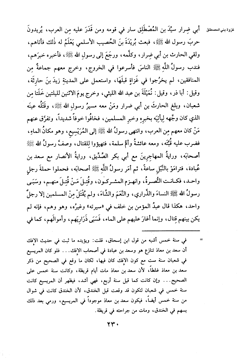 أَبِي ضِرَارٍ سَيِّدَ بَنِي الْمُصْطَلِقِ سَارَ فِي قَوْمِهِ، وَمَنْ قَدَرَ عَلَيْهِ مِنَ الْعَرَبِ يُرِيدُونَ حَرْبَ رَسُولِ اللَّهِ صَلَّى اللَّهُ عَلَيْهِ وَسَلَّمَ، فَبَعَثَ بُرَيْدَةَ بْنَ الْحُصَيْبِ الْأَسْلَمِيَّ يَعْلَمُ لَهُ ذَلِكَ، فَأَتَاهُمْ وَلَقِيَ الْحَارِثَ بْنَ أَبِي ضِرَارٍ، وَكَلَّمَهُ وَرَجَعَ إِلَى رَسُولِ اللَّهِ صَلَّى اللَّهُ عَلَيْهِ وَسَلَّمَ، فَأَخْبَرَهُ خَبَرَهُمْ، فَنَدَبَ رَسُولُ اللَّهِ صَلَّى اللَّهُ عَلَيْهِ وَسَلَّمَ النَّاسَ، فَأَسْرَعُوا فِي الْخُرُوجِ، وَخَرَجَ مَعَهُمْ جَمَاعَةٌ مِنَ الْمُنَافِقِينَ لَمْ يَخْرُجُوا فِي غَزَاةٍ قَبْلَهَا، وَاسْتَعْمَلَ عَلَى الْمَدِينَةِ زَيْدَ بْنَ حَارِثَةَ، وَقِيلَ: أبا ذر، وَقِيلَ: نميلة بن عبد الله الليثي، وَخَرَجَ يَوْمَ الِاثْنَيْنِ لِلَيْلَتَيْنِ خَلَتَا مِنْ شَعْبَانَ، وَبَلَغَ الْحَارِثَ بْنَ أَبِي ضِرَارٍ، وَمَنْ مَعَهُ مَسِيرُ رَسُولِ اللَّهِ صَلَّى اللَّهُ عَلَيْهِ وَسَلَّمَ وَقَتْلُهُ عَيْنَهُ الَّذِي كَانَ وَجَّهَهُ لِيَأْتِيَهُ بِخَبَرِهِ، وَخَبَرِ الْمُسْلِمِينَ، فَخَافُوا خَوْفًا شَدِيدًا، وَتَفَرَّقَ عَنْهُمْ مَنْ كَانَ مَعَهُمْ مِنَ الْعَرَبِ، وَانْتَهَى رَسُولُ اللَّهِ صَلَّى اللَّهُ عَلَيْهِ وَسَلَّمَ إِلَى الْمُرَيْسِيعِ، وَهُوَ مَكَانُ الْمَاءِ، فَضَرَبَ عَلَيْهِ قُبَّتَهُ، وَمَعَهُ عائشة وأم سلمة، فَتَهَيَّئُوا لِلْقِتَالِ، وَصَفَّ رَسُولُ اللَّهِ صَلَّى اللَّهُ عَلَيْهِ وَسَلَّمَ أَصْحَابَهُ، وَرَايَةُ الْمُهَاجِرِينَ مَعَ أَبِي بَكْرٍ الصِّدِّيقِ، وَرَايَةُ الْأَنْصَارِ مَعَ سَعْدِ بْنِ عُبَادَةَ، فَتَرَامَوْا بِالنَّبْلِ سَاعَةً، ثُمَّ أَمَرَ رَسُولُ اللَّهِ صَلَّى اللَّهُ عَلَيْهِ وَسَلَّمَ أَصْحَابَهُ، فَحَمَلُوا حَمْلَةَ رَجُلٍ وَاحِدٍ، فَكَانَتِ النُّصْرَةُ، وَانْهَزَمَ الْمُشْرِكُونَ، وَقُتِلَ مَنْ قُتِلَ مِنْهُمْ، وَسَبَى رَسُولُ اللَّهِ صَلَّى اللَّهُ عَلَيْهِ وَسَلَّمَ النِّسَاءَ وَالذَّرَارِي وَالنَّعَمَ وَالشَّاءَ، وَلَمْ يُقْتَلْ مِنَ الْمُسْلِمِينَ إلَّا رَجُلٌ وَاحِدٌ، هَكَذَا قَالَ عبد المؤمن بن خلف فِي " سِيرَتِهِ " وَغَيْرُهُ، وَهُوَ وَهْمٌ، فَإِنّهُ لَمْ يَكُنْ بَيْنَهُمْ قِتَالٌ، وَإِنَّمَا أَغَارَ عَلَيْهِمْ عَلَى الْمَاءِ، فَسَبَى ذَرَارِيَهُمْ وَأَمْوَالَهُمْ كَمَا فِي