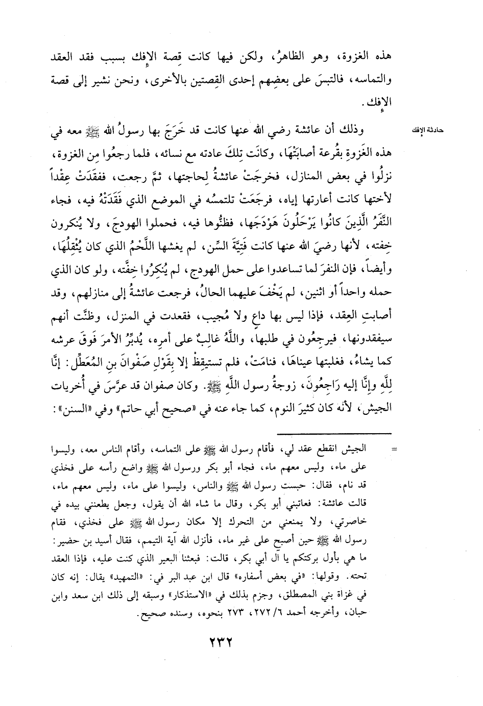هَذِهِ الْغَزْوَةِ، وَهُوَ الظَّاهِرُ، وَلَكِنْ فِيهَا كَانَتْ قِصَّةُ الْإِفْكِ بِسَبَبِ فَقْدِ الْعِقْدِ وَالْتِمَاسِهِ، فَالْتَبَسَ عَلَى بَعْضِهِمْ إحْدَى الْقِصَّتَيْنِ بِالْأُخْرَى، وَنَحْنُ نُشِيرُ إِلَى قِصَّةِ الْإِفْكِ.