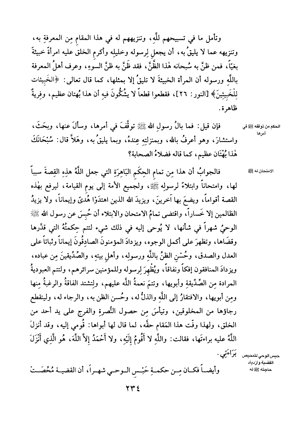 فَالْجَوَابُ: أَنَّ هَذَا مِنْ تَمَامِ الْحِكَمِ الْبَاهِرَةِ الَّتِي جَعَلَ اللَّهُ هَذِهِ الْقِصَّةَ سَبَبًا لَهَا، وَامْتِحَانًا وَابْتِلَاءً لِرَسُولِهِ صَلَّى اللَّهُ عَلَيْهِ وَسَلَّمَ وَلِجَمِيعِ الْأُمَّةِ إِلَى يَوْمِ الْقِيَامَةِ لِيَرْفَعَ بِهَذِهِ الْقِصَّةِ أَقْوَامًا وَيَضَعَ بِهَا آخَرِينَ، وَيَزِيدُ اللَّهُ الَّذِينَ اهْتَدَوْا هُدًى وَإِيمَانًا، وَلَا يَزِيدُ الظَّالِمِينَ إِلَّا خَسَارًا، وَاقْتَضَى تَمَامُ الِامْتِحَانِ وَالِابْتِلَاءِ أَنْ حُبِسَ عَنْ رَسُولِ اللَّهِ صَلَّى اللَّهُ عَلَيْهِ وَسَلَّمَ الْوَحْيُ شَهْرًا فِي شَأْنِهَا لَا يُوحَى إِلَيْهِ فِي ذَلِكَ شَيْءٌ لِتَتِمَّ حِكْمَتُهُ الَّتِي قَدَّرَهَا وَقَضَاهَا، وَتَظْهَرَ عَلَى أَكْمَلِ الْوُجُوهِ، وَيَزْدَادَ الْمُؤْمِنُونَ الصَّادِقُونَ إِيمَانًا وَثَبَاتًا عَلَى الْعَدْلِ وَالصِّدْقِ وَحُسْنِ الظَّنِّ بِاللَّهِ وَرَسُولِهِ وَأَهْلِ بَيْتِهِ وَالصِّدِّيقِينَ مِنْ عِبَادِهِ، وَيَزْدَادَ الْمُنَافِقُونَ إِفْكًا وَنِفَاقًا، وَيُظْهِرَ لِرَسُولِهِ وَلِلْمُؤْمِنِينَ سَرَائِرَهُمْ، وَلِتَتِمَّ الْعُبُودِيَّةُ الْمُرَادَةُ مِنَ الصِّدِّيقَةِ وَأَبَوَيْهَا، وَتَتِمَّ نِعْمَةُ اللَّهِ عَلَيْهِمْ، وَلِتَشْتَدَّ الْفَاقَةُ وَالرَّغْبَةُ مِنْهَا وَمِنْ أَبَوَيْهَا، وَالِافْتِقَارُ إِلَى اللَّهِ وَالذُّلُّ لَهُ وَحُسْنُ الظَّنِّ بِهِ وَالرَّجَاءُ لَهُ، وَلِيَنْقَطِعَ رَجَاؤُهَا مِنَ الْمَخْلُوقِينَ، وَتَيْأَسَ مِنْ حُصُولِ النُّصْرَةِ وَالْفَرَجِ عَلَى يَدِ أَحَدٍ مِنَ الْخَلْقِ، وَلِهَذَا وَفَّتْ هَذَا الْمَقَامَ حَقَّهُ لَمَّا «قَالَ لَهَا أَبَوَاهَا: قُومِي إِلَيْهِ، وَقَدْ أَنْزَلَ اللَّهُ عَلَيْهِ بَرَاءَتَهَا، فَقَالَتْ: (وَاللَّهِ لَا أَقُومُ إِلَيْهِ وَلَا أَحْمَدُ إلَّا اللَّهَ هُوَ الَّذِي أَنْزَلَ بَرَاءَتِي» ) .