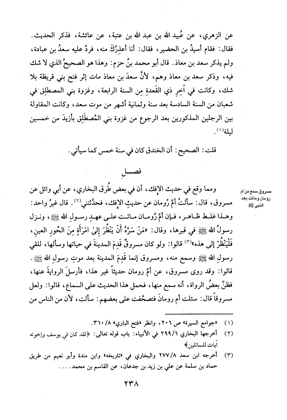 وَمِمَّا وَقَعَ فِي حَدِيثِ الْإِفْكِ أَنَّ فِي بَعْضِ طُرُقِ الْبُخَارِيِّ عَنْ أبي وائل عَنْ مسروق، قَالَ: سَأَلْتُ أم رومان عَنْ حَدِيثِ الْإِفْكِ فَحَدَّثَتْنِي. قَالَ غَيْرُ وَاحِدٍ: وَهَذَا غَلَطٌ ظَاهِرٌ، فَإِنَّ أم رومان مَاتَتْ عَلَى عَهْدِ رَسُولِ اللَّهِ صَلَّى اللَّهُ عَلَيْهِ وَسَلَّمَ، وَنَزَلَ رَسُولُ اللَّهِ صَلَّى اللَّهُ عَلَيْهِ وَسَلَّمَ فِي قَبْرِهَا، وَقَالَ: ( «مَنْ سَرَّهُ أَنْ يَنْظُرَ إِلَى امْرَأَةٍ مِنَ الْحُورِ الْعِينِ فَلْيَنْظُرْ إِلَى هَذِهِ» ) ، قَالُوا: وَلَوْ كَانَ مسروق قَدِمَ الْمَدِينَةَ فِي حَيَاتِهَا، وَسَأَلَهَا لَلَقِيَ رَسُولَ اللَّهِ صَلَّى اللَّهُ عَلَيْهِ وَسَلَّمَ وَسَمِعَ مِنْهُ، ومسروق إنَّمَا قَدِمَ الْمَدِينَةَ بَعْدَ مَوْتِ رَسُولِ اللَّهِ صَلَّى اللَّهُ عَلَيْهِ وَسَلَّمَ. قَالُوا: وَقَدْ رَوَى مسروق عَنْ أم رومان حَدِيثًا غَيْرَ هَذَا فَأَرْسَلَ الرِّوَايَةَ عَنْهَا، فَظَنَّ بَعْضُ الرُّوَاةِ أَنَّهُ سَمِعَ مِنْهَا، فَحَمَلَ هَذَا الْحَدِيثَ عَلَى السَّمَاعِ، قَالُوا: وَلَعَلَّ مسروقا قَالَ: سُئِلَتْ أم رومان، فَتَصَحَّفَتْ عَلَى بَعْضِهِمْ: سَأَلَتْ، لِأَنَّ مِنَ النَّاسِ مَنْ